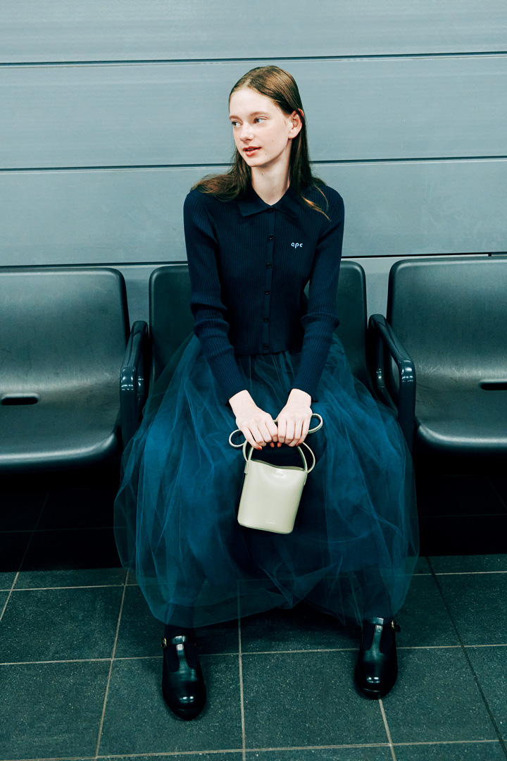 バッグ¥20900/YAHKI(ヤーキ オンラインストア)、ニットポロ¥36300/A.P.C.(アー・ペー・セー カスタマーサービス)、スカート¥33000/Bilitis dix-sept ans(ビリティス)、シューズ¥22000/LOISIR(ロワズィール)、その他/スタイリスト私物