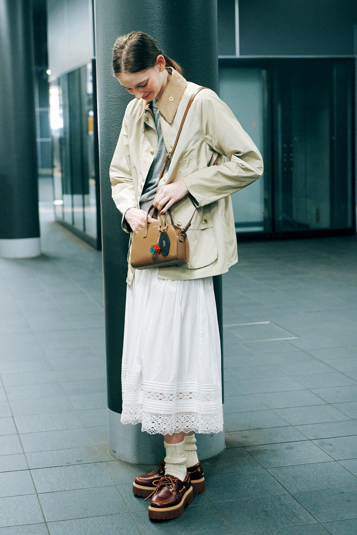 バッグ¥71500、チャーム(黒)¥14300/ともにA.P.C.(アー・ペー・セー カスタマーサービス)、チャーム(マジックキューブ)¥528/HIGHTIDE(ハイタイド)、ジャケット¥52800/Barbour( バブアー パートナーズジャパン)、セーター¥33000/LOEFF(エイチ ビューティ&ユース)、スカート¥39600/Bilitis dix-sept ans(ビリティス)、シューズ¥25300/Timberland(VFジャパン)、その他/スタイリスト私物