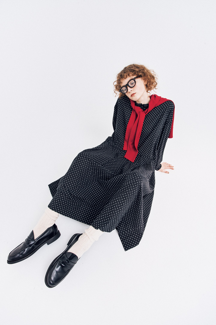 ソックス¥3960/YAECA(ヤエカ アパートメント ストア)、シューズ¥70400/SANDERS(サンダース ジャパン)、ワンピース¥50600/Véritécoeur (ヴェリテクール)、カーディガン¥28600/Brooks Brothers(ブルックス ブラザーズ ジャパン)、メガネ¥70400/EYEVAN 7285(アイヴァン 7285 トウキョウ)