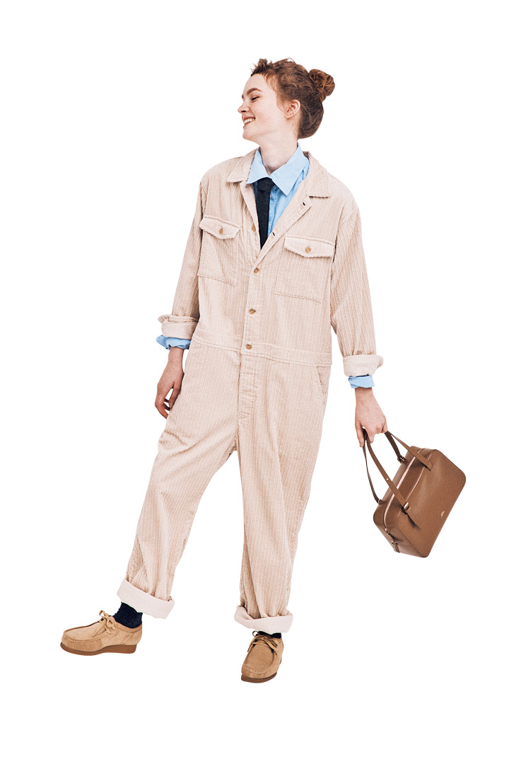 ソックス¥3080/Véritécoeur (ヴェリテクール)、シューズ¥20900/CLARKS(クラークスジャパン)、ジャンプスーツ¥80300/Yarmo(グラストンベリーショールーム)、シャツ[一部店舗限定]¥9990/Gap(ギャップ)、ネクタイ¥19800/ANATOMICA(アナトミカ 東京)、バッグ¥93500/A.P.C.(アー・ペー・セー カスタマーサービス)