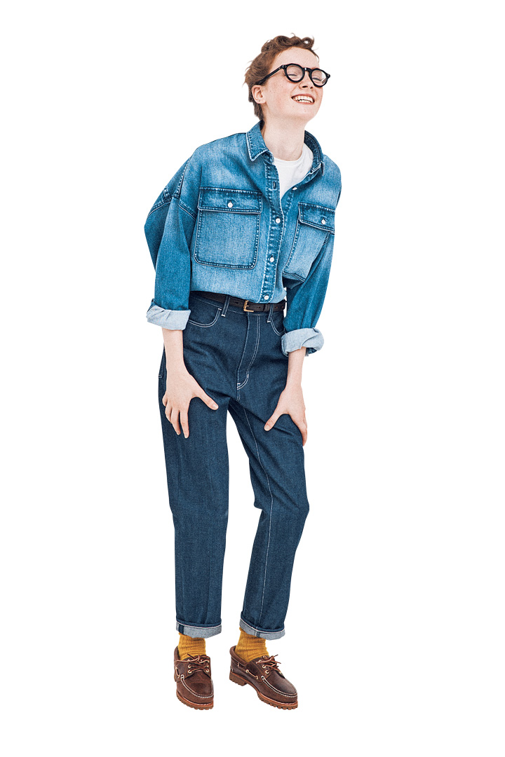 ソックス¥10780/PANTHERELLA(真下商事)、シューズ¥25300/Timberland(VF ジャパン)、シャツ¥19800/Healthy DENIM × green labelrelaxing(ユナイテッドアローズ グリーンレーベル リラクシング ルミネ有楽町店)、Tシャツ¥7920/ATTISESSION(アティセッション 新宿店)、デニムパンツ¥33000/LOEFF(エイチ ビューティー&ユース)、ベルト¥22000/Scye(マスターピースショールーム)、メガネ¥42900/EYEVAN(アイヴァン 東京ギャラリー)