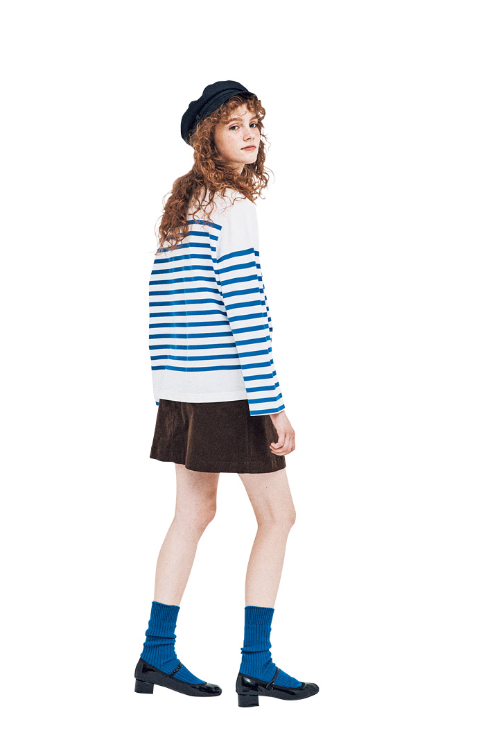 カラーソックスの唐突感が否めない場合、トップスや小物から色を拾うとうまくいく。ボーダーやキャスケットとリンクさせたブルーのソックスが、愛らしいでしょ!