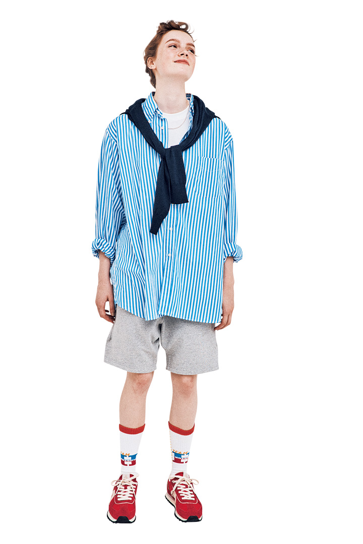 ソックス¥1870/HOiSUM(ホイサム)、スニーカー¥16500/ASFVLT(アースマーケティング)、シャツ¥39600/INDIVIDUALIZEDSHIRTS(メイデン・カンパニー)、Tシャツ¥990/MUJI( 無印良品 銀座)、肩にかけたセーター¥55000/JOHN SMEDLEY(リーミルズ エージェンシー)、ショートパンツ¥5940/GOAT( トウキョウデザインベース)、ネックレス¥22000/Jouete(ジュエッテ)