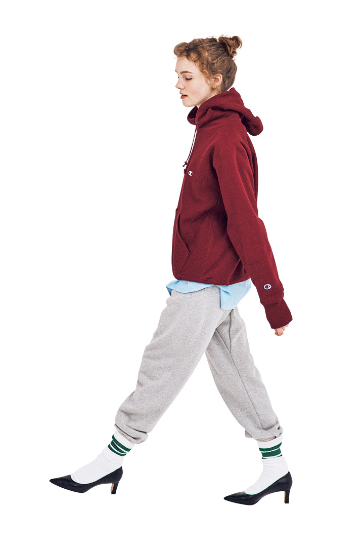 ソックス¥1474/United Athle(キャブ)、パンプス¥51700/KATIM(カチム)、フーディ¥15180/Champion(ヘインズブランズ ジャパン カスタマーセンター)、シャツ¥44000/INDIVIDUALIZED SHIRTS(メイデン・カンパニー)、スウェットパンツ¥38500/YAECA( ヤエカ アパートメント ストア)、バッグ¥45100/IL BISONTE(ルック D.C事業部)