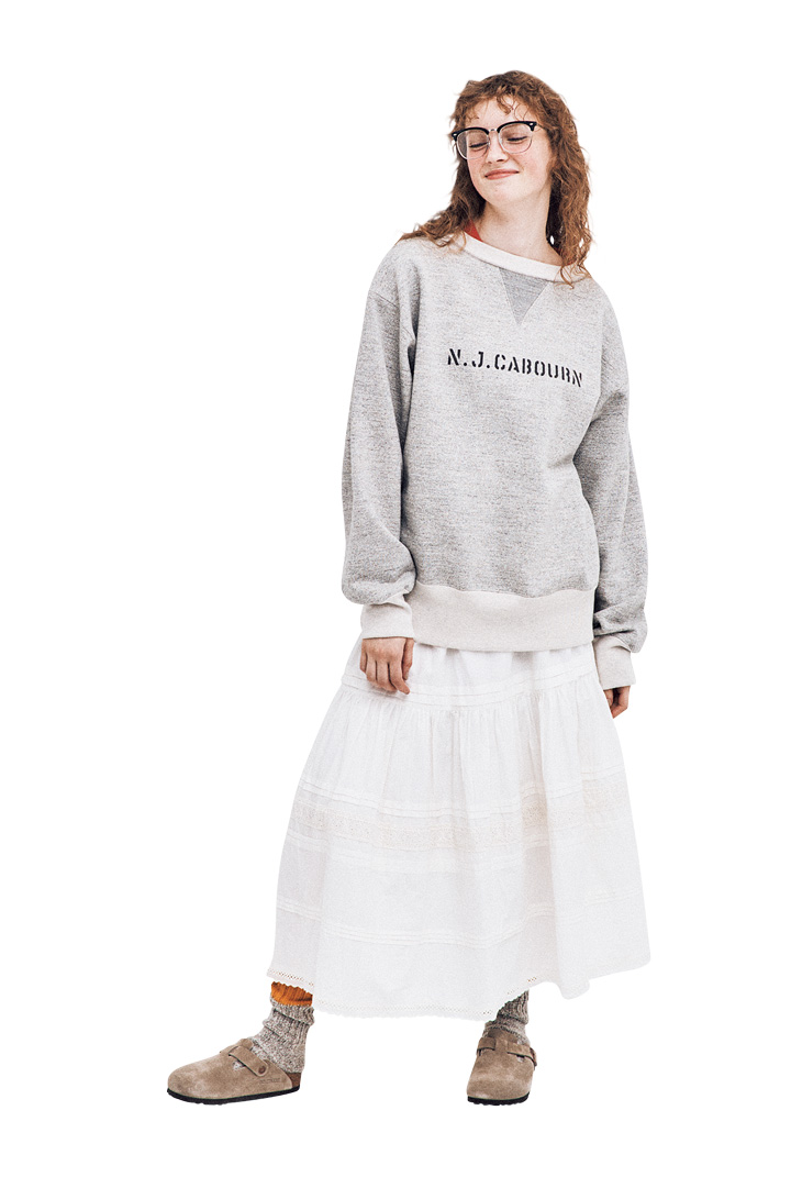 ソックス¥3850/ROTOTO(ロトトショールーム)、サンダル¥24200/BIRKENSTOCK(ビルケンシュトック・ジャパン カスタマーサービス)、スウェットシャツ¥37400/NigelCabourn(アウターリミッツ)、Tシャツ¥5500/Healthknit × BEAMS BOY(ビームスボーイ 原宿)、スカート¥11000/FREAK’SSTORE(フリークス ストア渋谷)、メガネ¥22770/Ray-Ban(ルックスオティカジャパン カスタマーサービス)