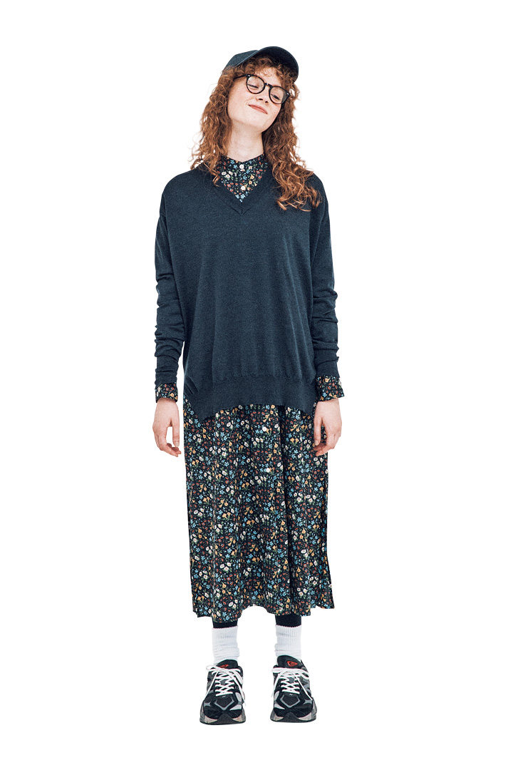 タイツ¥1320、ソックス¥990/ともに靴下屋(タビオ)、スニーカー¥24200/New Balance(ニューバランスジャパンお客様相談室)、セーター¥51700/JOHN SMEDLEY(リーミルズ エージェンシー)、ワンピース¥42900/Tradi tionalWeatherwear (トラディショナル ウェザーウェア渋谷店 )、キャップ¥4400/‘47(フォーティーセブン)、メガネ¥62810/Oliver Peoples(ルックスオティカジャパン カスタマーサービス)
