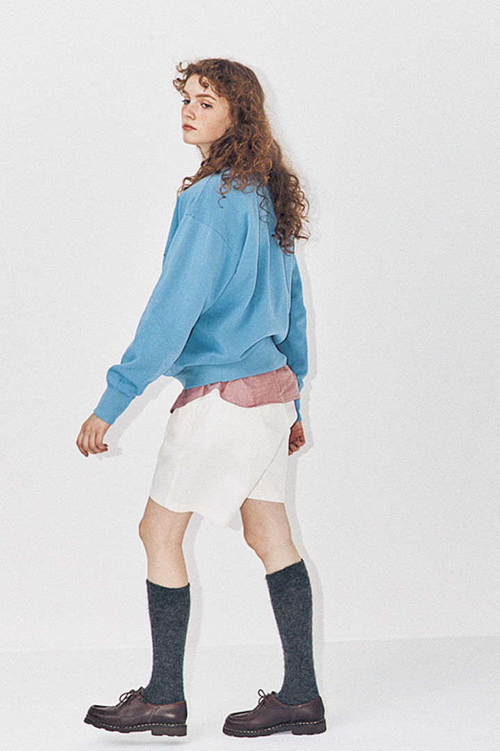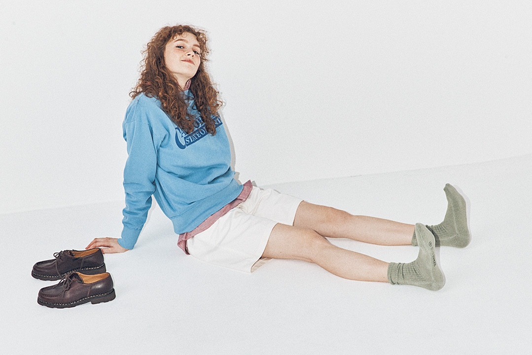 ¥3960/CHICSTOCKS(ノーデザイン)シューズ¥94600/Paraboot (パラブーツ青山店)、シャツ¥44000/INDIVIDUALIZEDSHIRTS、スウェットシャツ¥14850/MIXTA(ともにメイデン・カンパニー)、ショートパンツ¥27500/ANATOMICA(アナトミカ 東京)