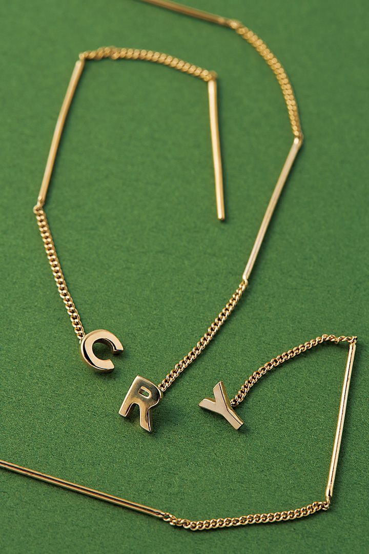 優雅、しなやか、動きのあるデザイン、そして日本人の肌が美しく見える色合いが特徴の《ラ・スール》。耳の後ろからチェーンを垂らすタイプのアメリカンピアスは、先端にイニシャルモチーフがちょこんと配されている。