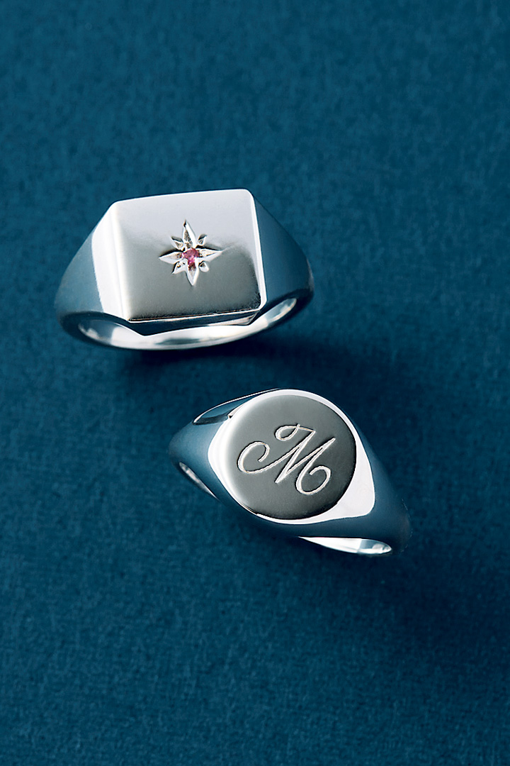 シグネットリングから着想を得た《マリハ》の指輪。誕生石をセットしたり、イニシャルを刻印することができる。ラウンド、スクエア、ハートの3型と、シルバー、ゴールドの2色から好きなものをセレクトして。