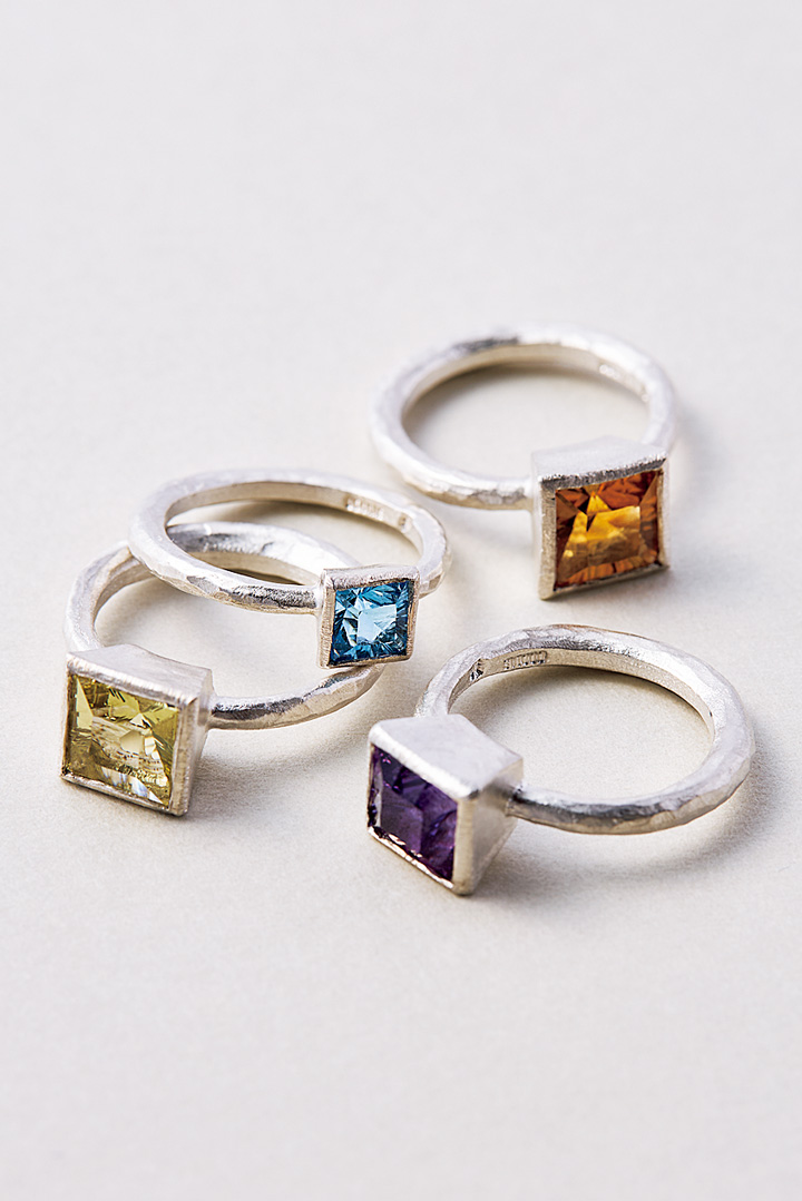 左から時計まわりに、ポジティブな気持ちに導くレモンクォーツ、誠実さと知性を育むブルートパーズ、幸運を引き寄せるシトリン、愛や友情を深めるガーネット。さあ、どの「キューブリング」にする?