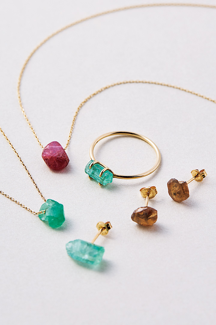 結晶の形や採掘されたときの表情を大切にする「原石」シリーズは、飾らない美しさがいい。ルビーは7月、エメラルドは5月、ジルコンは12月の誕生石。