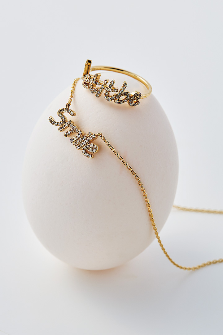 “let it be(あるがままに)”や“Smile(笑顔)”といったポジティブなメッセージをダイヤモンドで届ける、大人顔なリングとネックレス。ヴィンテージジュエリーをモダナイズする《ジジ》からピックアップ。
