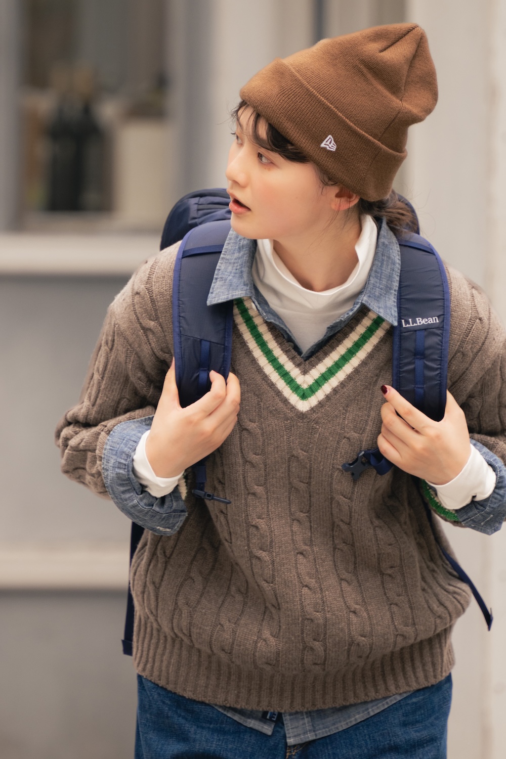セーター¥39600、タートルネックカットソー¥11000/ともにSLOANE(ザ ショップスローン 新静岡セノバ店)、シャツ¥11000、バックパック¥17600/ともにL.L.Bean (エル・エル・ビーン カスタマーサービスセンター)、デニムパンツ¥36300/SCYE BASICS(マスターピースショールーム)、ニットキャップ¥3520/New Era®︎(ニューエラ)、シューズ¥18700/adidas(アディダスお客様窓口)