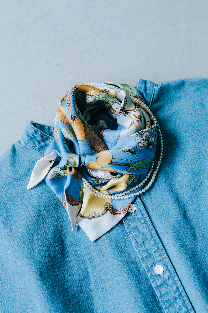 スカーフ¥16500/manipuri( マニプリ)、ネックレス¥48400/Lilas(スピック&スパン ルミネ有楽町店)、デニムシャツ¥19910/MidiUmi(マザーズインダストリー)