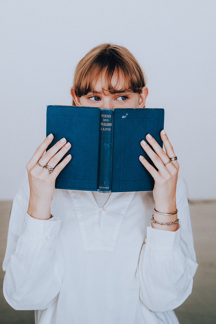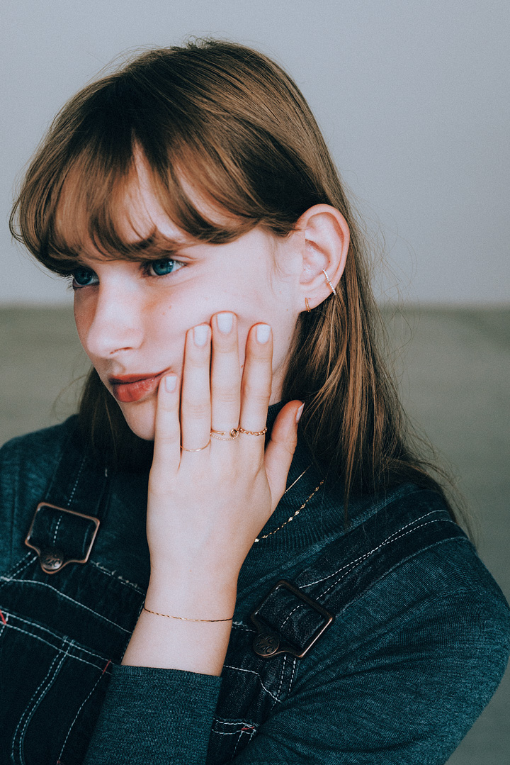 イヤーカフ¥121000/PRMAL(プライマル)、ピアス¥25300/PLUIE(プリュイ トウキョウ)、リング(薬指)(人差し指)各¥14300、ネックレス(上)¥19800/以上すべてles bonbon(フーブス)、リング(中指・上)¥77000/e.m.、ブレスレット¥104500/little emblem(ともにイー・エム 青山店)、リング(中指・下)¥6600/ete(エテ)、ネックレス(下)¥50600/MONICE(フォーティーン ショールーム)、セーター¥25300/THESHINZONE(シンゾーン ルミネ新宿店)、オーバーオール¥22000/BIGMAC × B EAMS BOY(ビームス ボーイ 原宿)