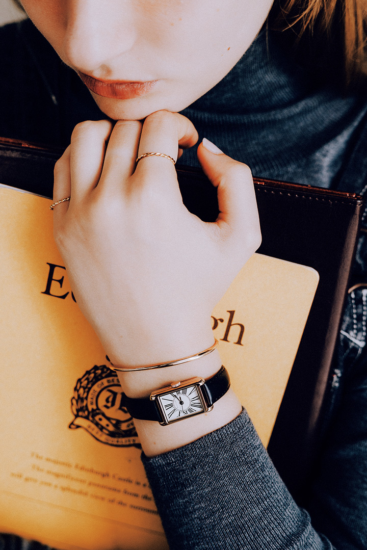 ジュエリーの色と腕時計のケースの色を合わせると、統一感が生まれてこなれる仕組み。