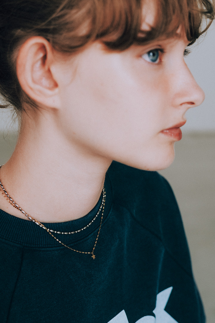 ネックレス(上)¥28 6 0 0/Rieuk(リューク)、(下)¥30800/les bonbon(フーブス)、スウェットシャツ¥10230/HANDTEX×JEANS FACTORY(ジーンズ ファクトリー 卸団地本店)
