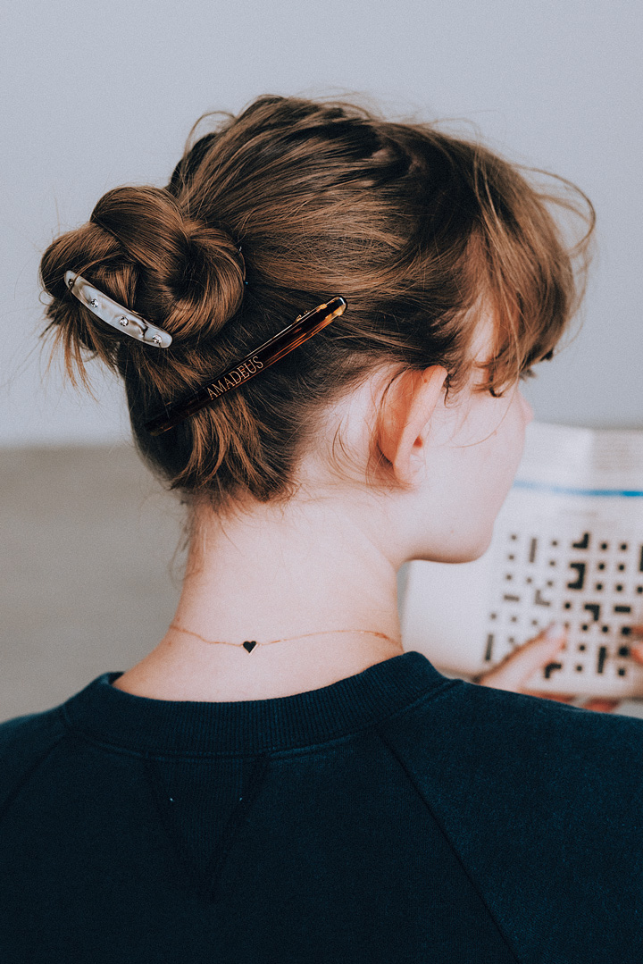 前にも後ろにもモチーフがあるネックレスやバレッタで、バックスタイルにまで気を配るのが上級者になる秘訣。