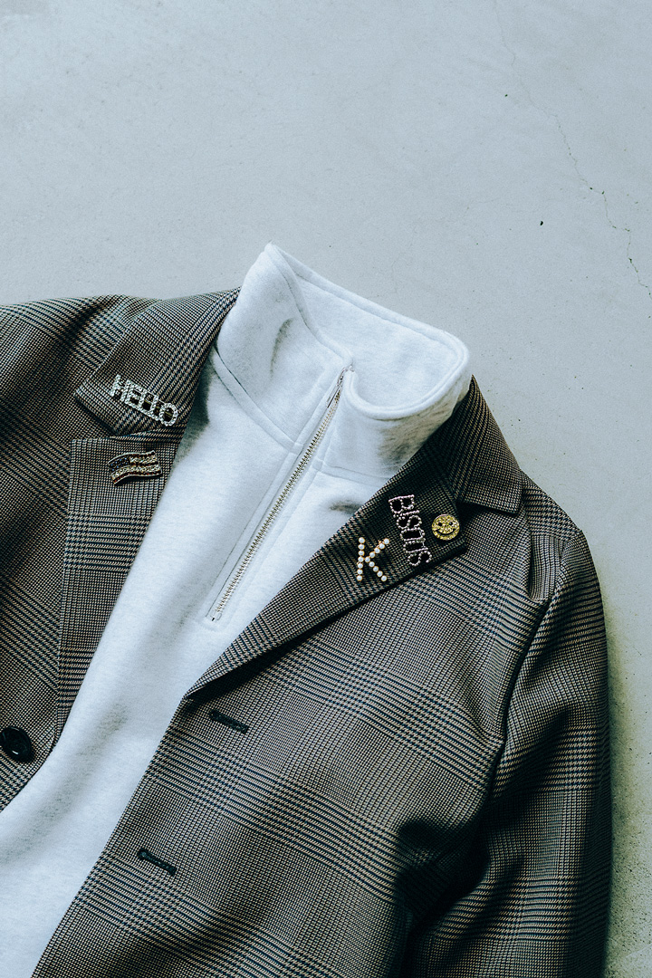 ブローチ(HELLO)(スマイル)(米国旗)各¥2640/BEAMS BOY(ビームスボーイ 原宿)、(BISOUS)¥17600/ADER.bijoux(アデルビジュー ショールーム)、(K)¥16500/La S oeur(ラ・スール)、ジャケット¥30910/BEAMS BOY(ビームス ボーイ 原宿)、スウェットシャツ¥18700/BLUESCENTRIC(メイデン・カンパニー)