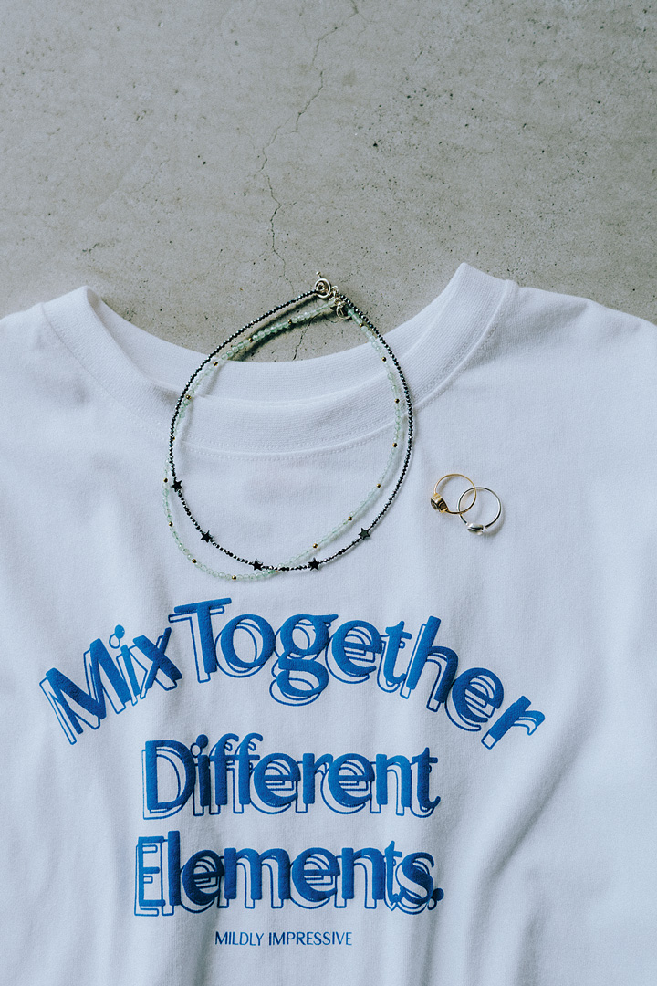ガーリーなストーンジュエリーを合わせればカジュアルなロゴTeeに女性らしさが漂う。