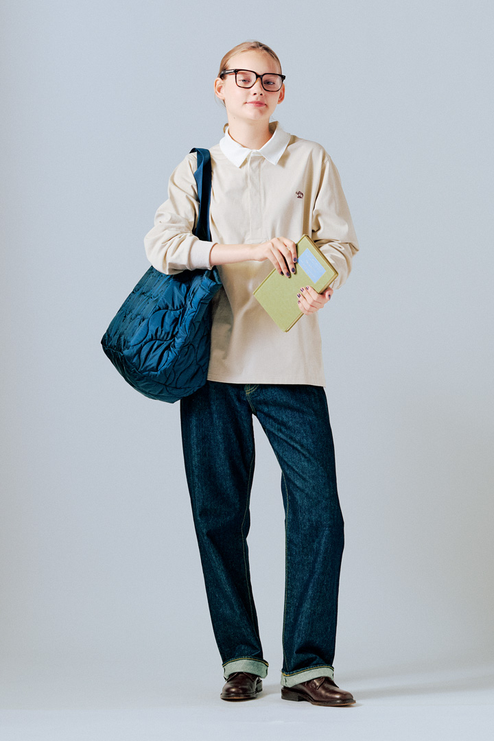 気負わず穿けるリラックスシルエットのデニムパンツは、《エムエイチエル. 》と《キャントンオーバーオールズ》のコラボレーション。ラフさをとことん満喫すべく、ベルトなしで腰穿きってのもいいね。知的でフレッシュな濃紺×イエローの色合わせも間違いない。