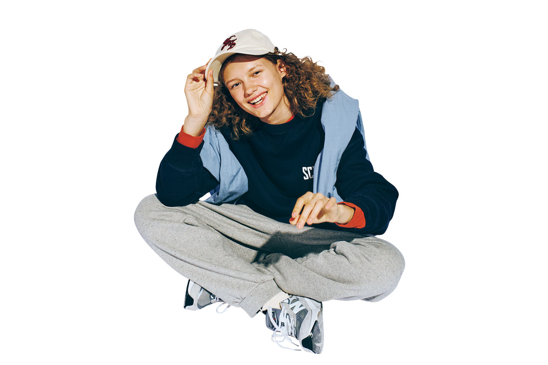 スウェットシャツ¥35200 / SCYE BASICS(マスターピースショールーム)、カットソー¥14300、パンツ¥19800 /ともにUpcycleLino BASIC(ネストローブ 渋谷店)、肩にかけたシャツ¥28600 / YAECA(ヤエカ アパートメント ストア)、キャップ¥9680 / THESHINZONE(シンゾーン ルミネ新宿店)、スニーカー¥39600 / New Balance(ニューバランスジャパンお客様相談室)