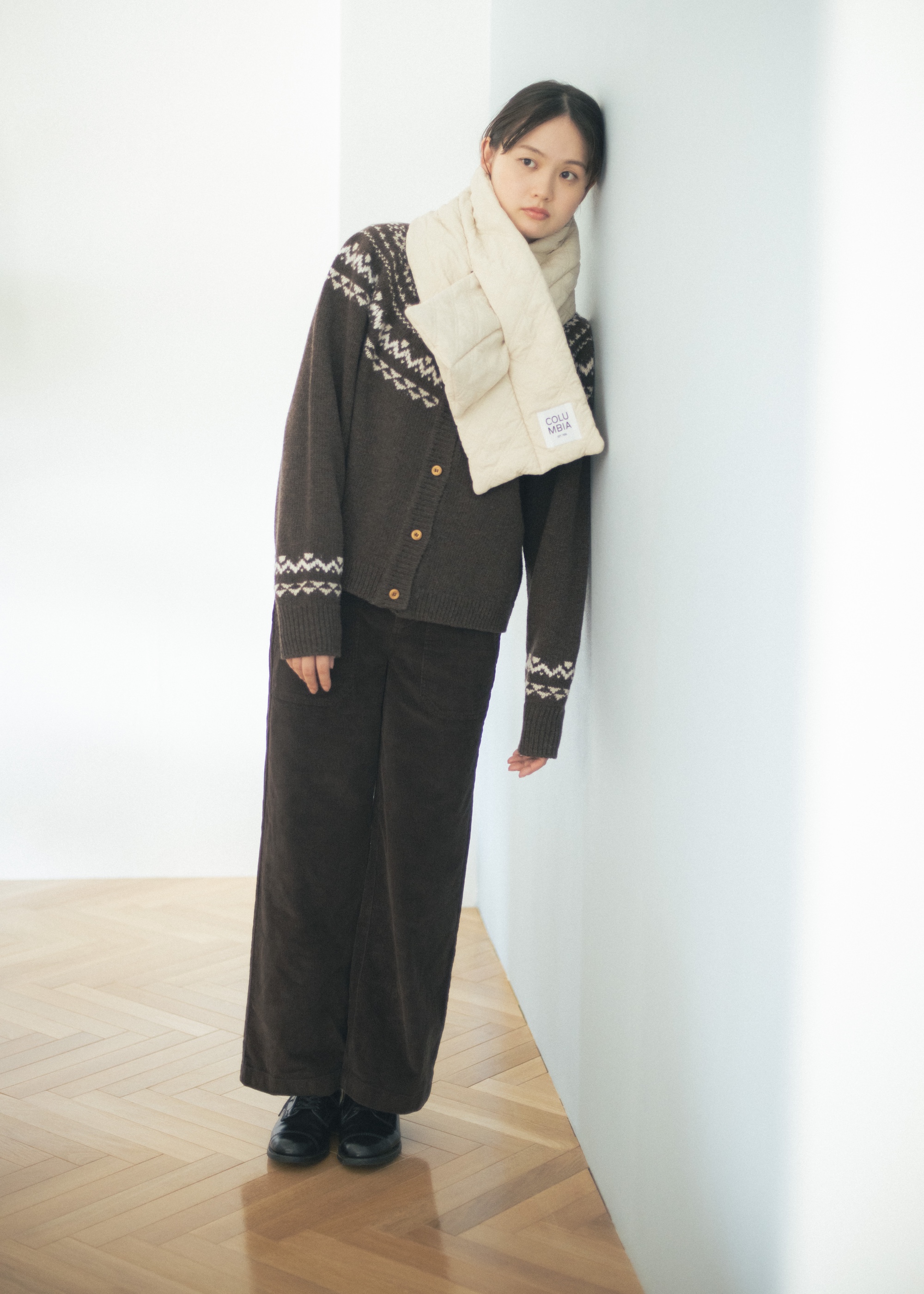 ブラウンのカーディガンに、コーデュロイパンツ。茶トラをお手本にコーディネート。ボリュームのある、白色のパフマフラーでアクセントをつけて。このふわふわなマフラーの触り心地がちょっとネコぽい。レザーのレースアップシューズのトラッドを意識して。