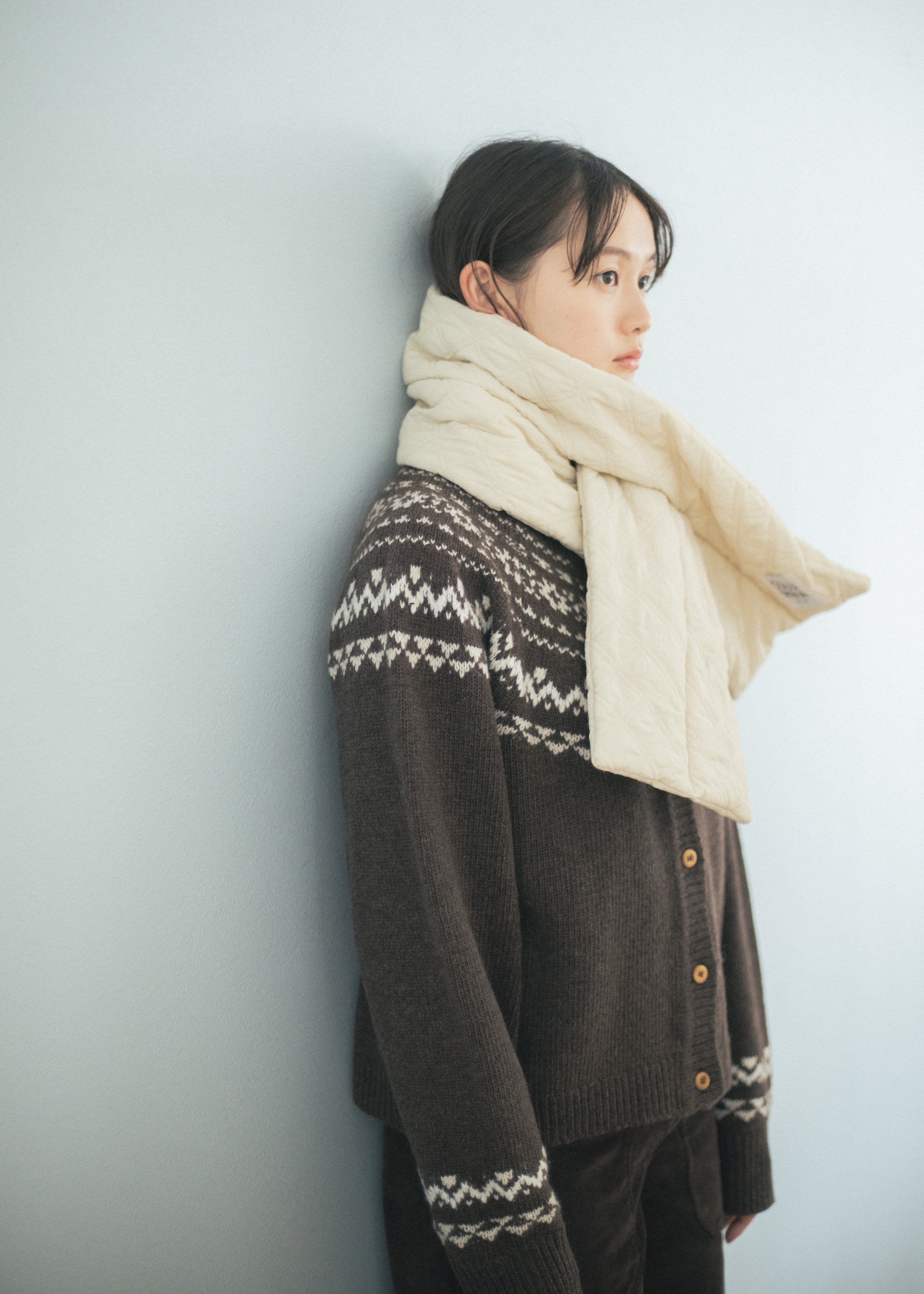 カーディガン¥18920 / MidiUmi(マザーズ インダストリー)、パンツ¥14300 / L.L.Bean(エル・エル・ビーンカスタマーサービスセンター)、マフラー¥5940 / Columbia(コロンビアスポーツウェアジャパン)、ソックス(6P)¥4180 / THE RAILROAD SOCK(メイデン・カンパニー)、シューズ¥68200 / SANDERS(サンダースジャパン)