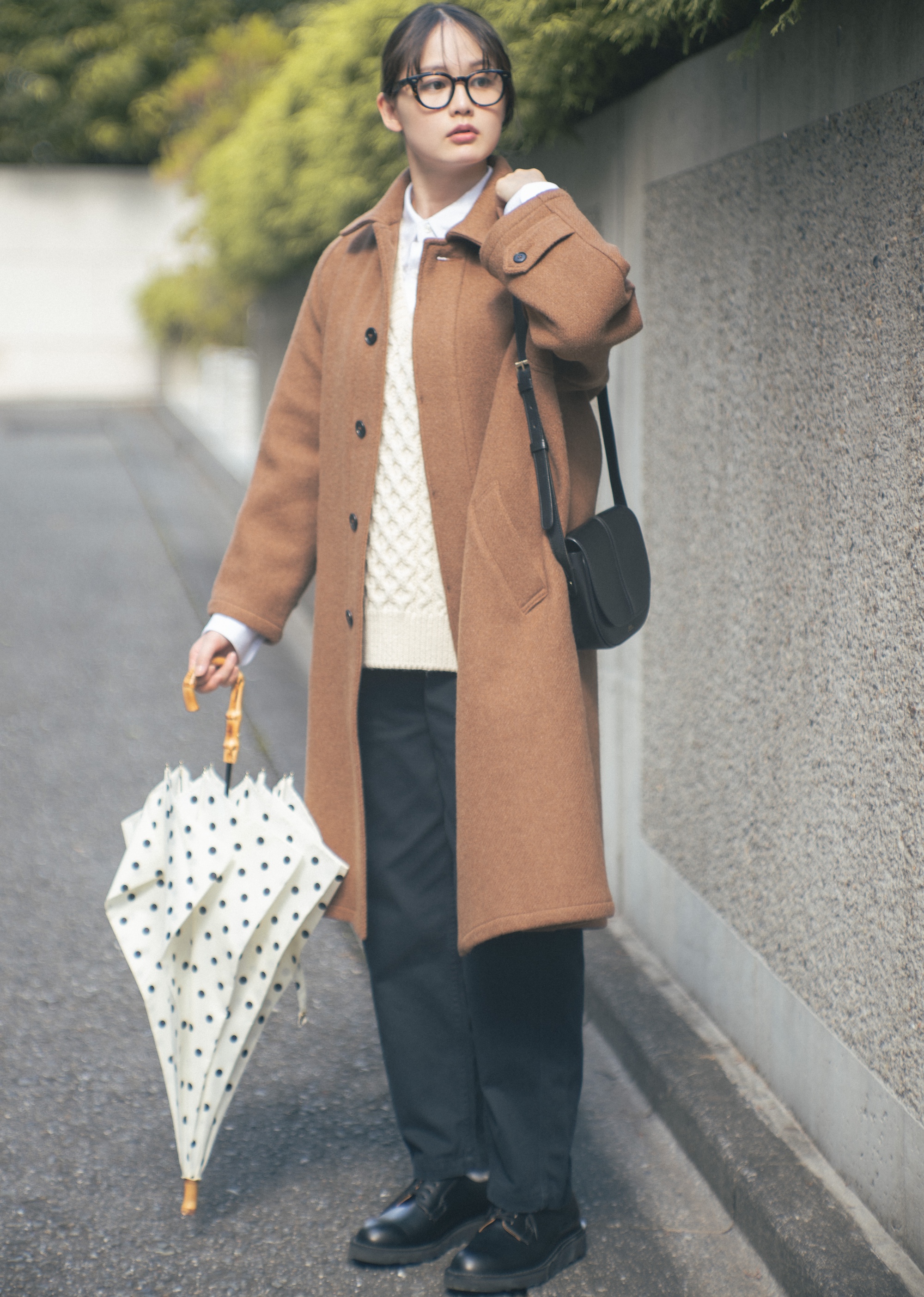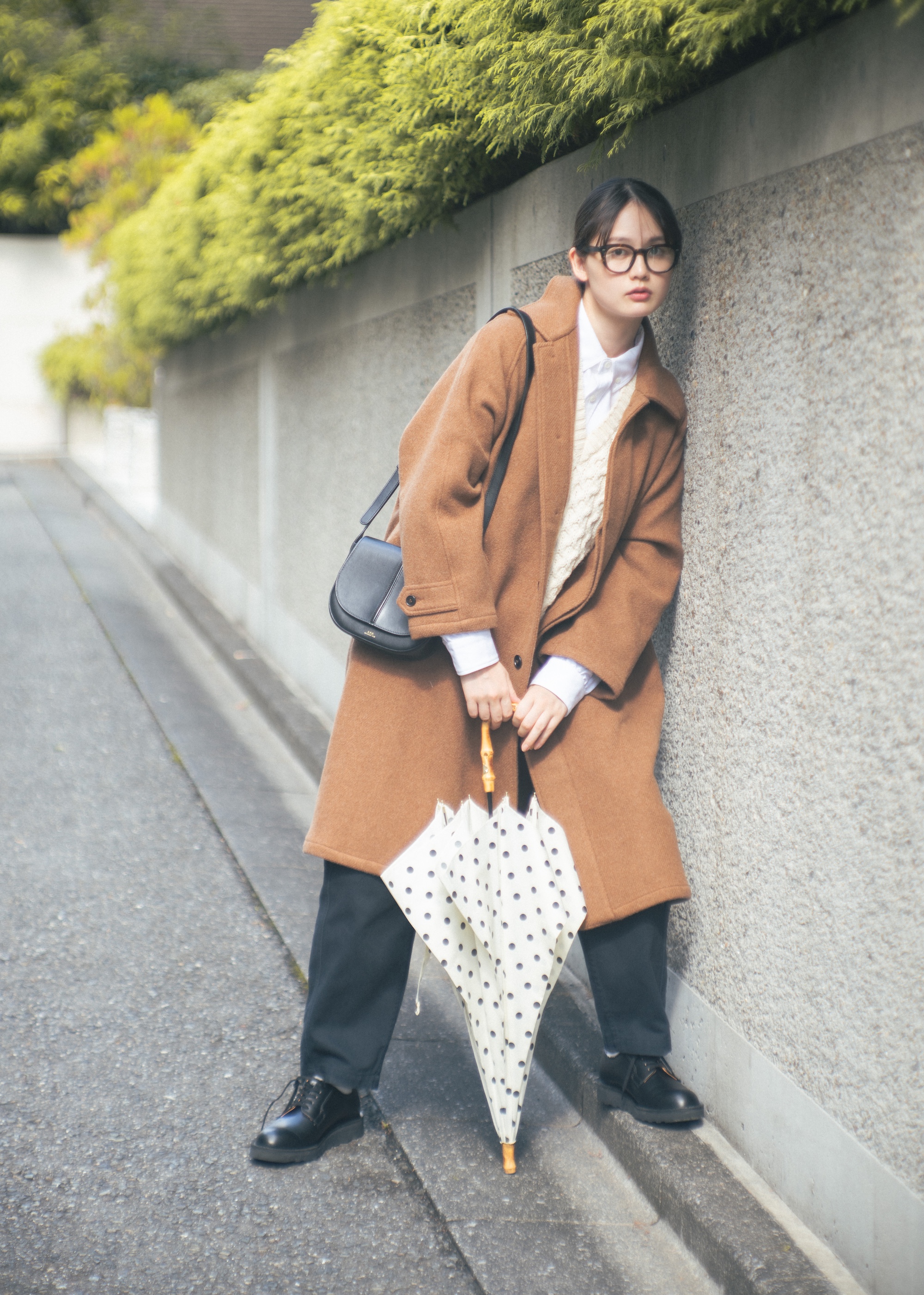 コート¥53900 / HTS(ビューカリック&フロリック)、べスト¥29700 / PEREGRINE(真下商事)、シャツ¥19910 / MidiUmi(マザーズ インダストリー)、パンツ¥19800 / SHIPS NINE CASE(シップス インフォメーションセンター)、メガネ¥62810 / Oliver Peoples(ルックスオティカジャパン カスタマーサービス)、バッグ¥85800 / A.P.C.(アー・ペー・セー カスタマーサービス)、ソックス(6P)¥4180 / THE RAILROAD SOCK (メイデン・カンパニー)、シューズ¥29700/DANNER(ABCマート)、傘¥14300 / Traditional Weatherwear(トラディショナル ウェザーウェア 渋谷店)