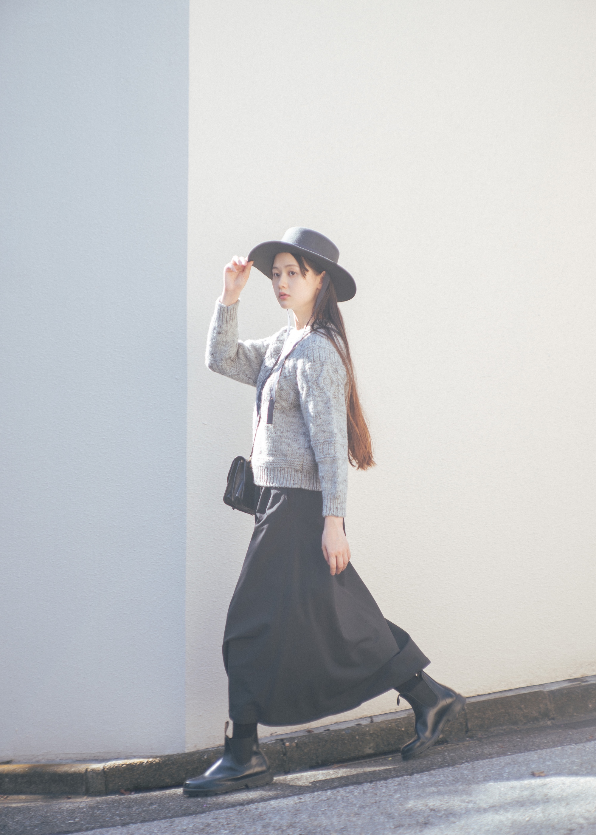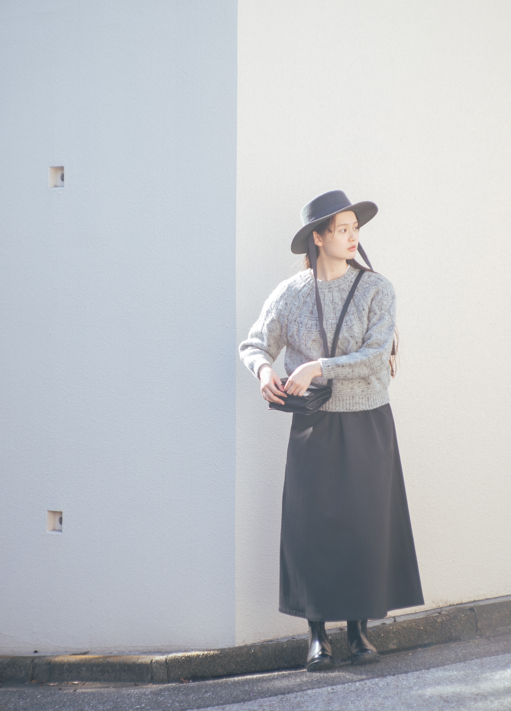 サバトラを意識して、グレーに黒がドットのようにミックスされたセーターをチョイス。それ以外をオールブラックで潔くまとめた、艶っぽい上品なロングスカートとブーツでレディなトラッドスタイル。ネコのようなタッチのハットをさらりとかぶって、クールに決めましょう。