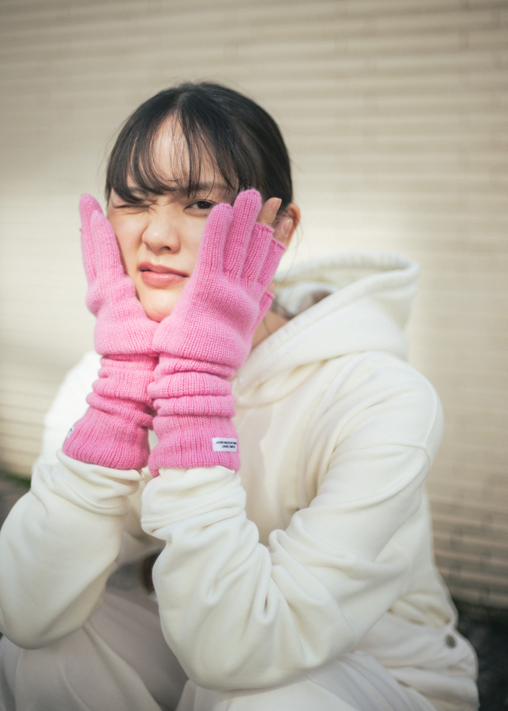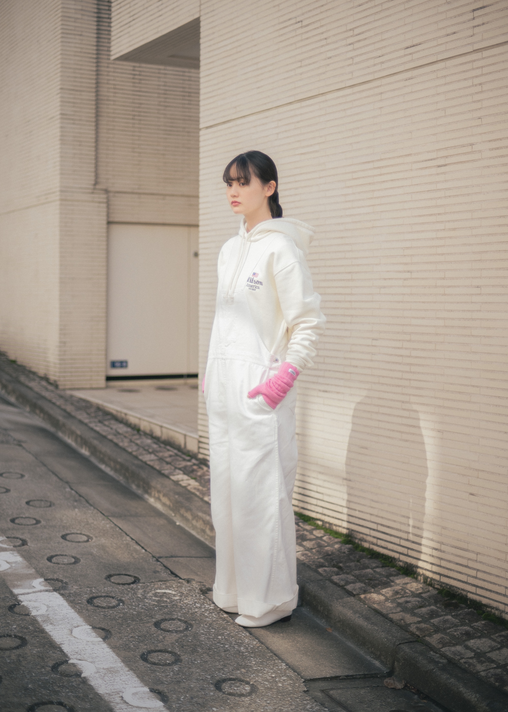 寒い季節になると更に映える、オールホワイトの着こなしは優雅な白ネコをイメージ。スポーティなフーディと華奢な紐がレディなオーバーオールは、良いバランスの組み合わせ。手元には肉球を意識した、ピンクのグローブで差し色をしたのがポイント。