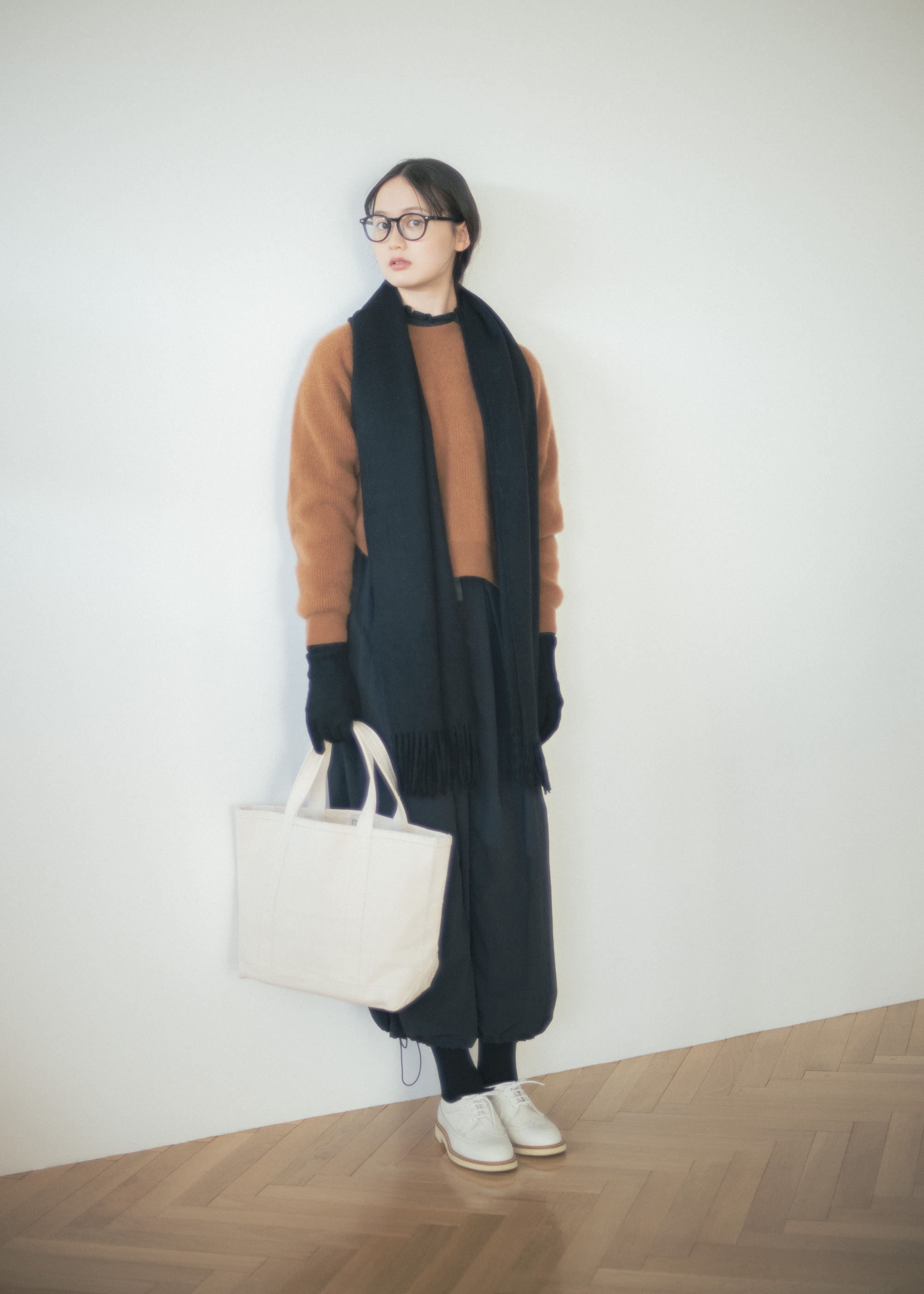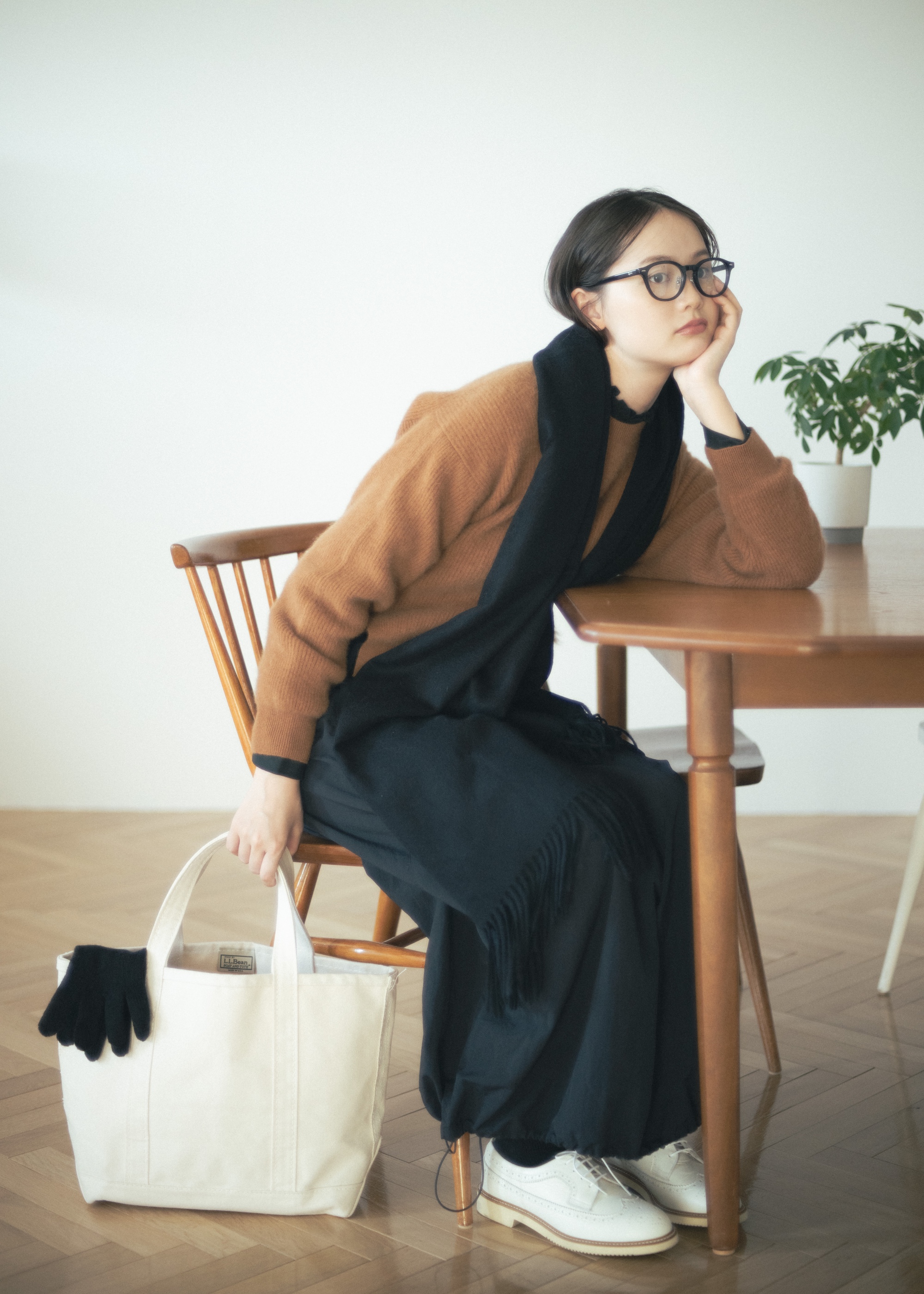セーター¥46200 / BATONER(バトナー)、ブラウス¥15950 / MidiUmi(マザーズ インダストリー)、スカート¥17380 / Gramicci × BEAMS BOY(ビームス公式オンラインショップ)、メガネ¥22770 / Ray-Ban(ルックスオティカジャパン カスタマーサービス)、マフラー¥18700 / To b. by agnès b. (トゥービー バイ アニエスベー )、グローブ¥18700 / JOHN SMEDLEY(リーミルズ エージェンシー)、バッグ¥11000 / L.L.Bean(エル・エル・ビーンカスタマーサービスセンター)、タイツ¥5500 / MHL.(エムエイチエル.)、シューズ¥15400 / HARUTA(ハルタ)
