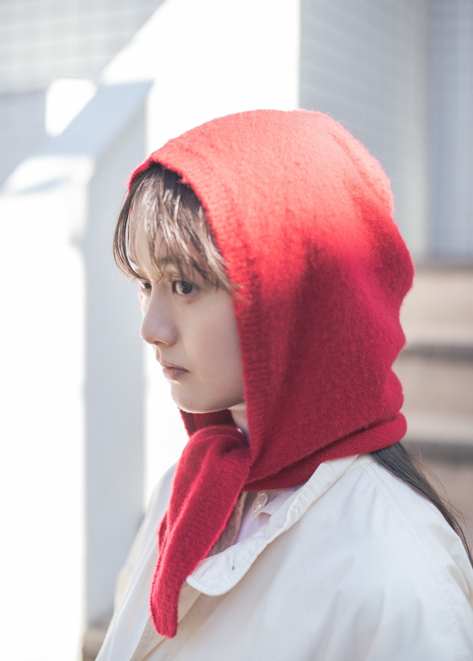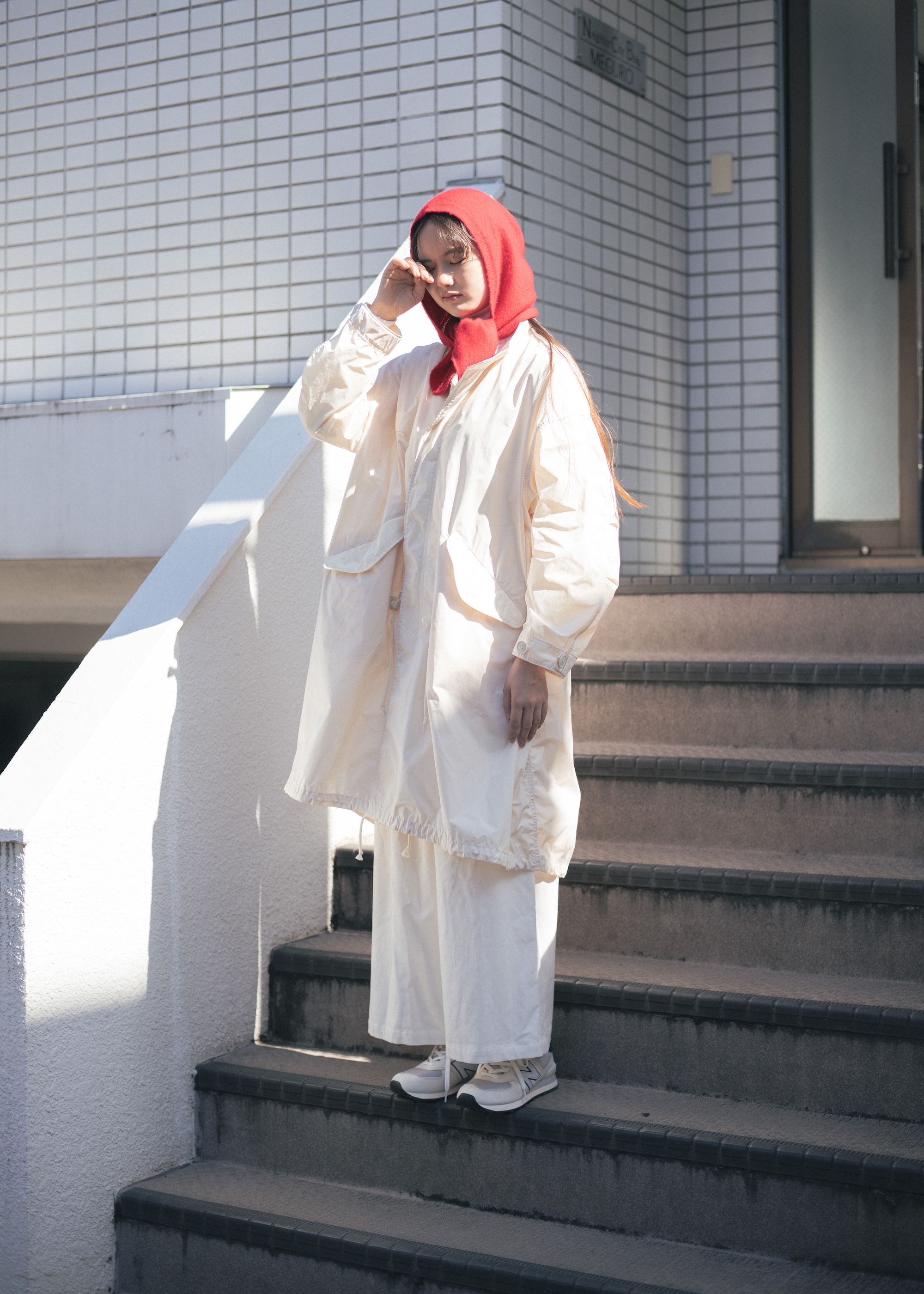 白ネコのようにオールホワイトでまとめた着こなしに、首輪のような感覚で赤のフードを巻いて。クリーンな色に、鮮やかな差し色を持ってくると、グッとこなれたコーディネートになる。寒さ対策をしながら、お洒落もしちゃうなんて、ネコをお手本にしてみて正解!
