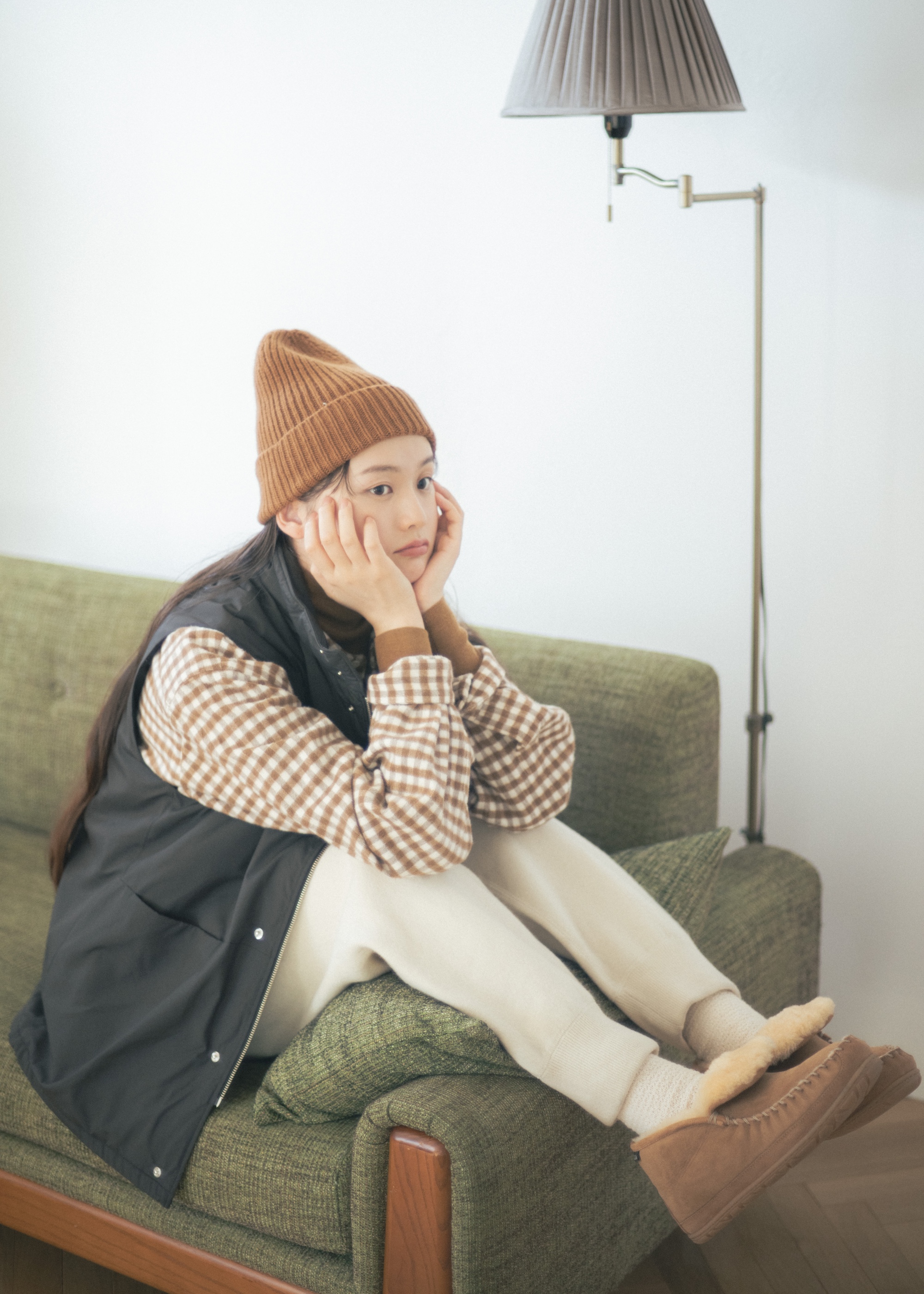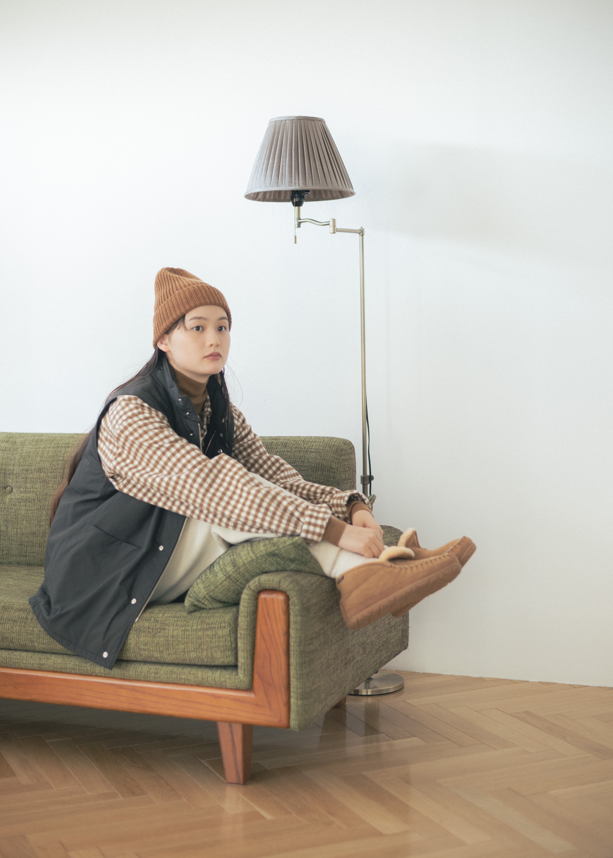 三毛猫をイメージした茶色、黒、白はベーシックな色だから、チェック柄でニュアンスを足すと、抑揚のある着こなしになるので取り入れたい。黒のベストは、グッと引き締める役割として。ふわふわのボアが心地よい、ムートンシューズで足元までネコを気取って。