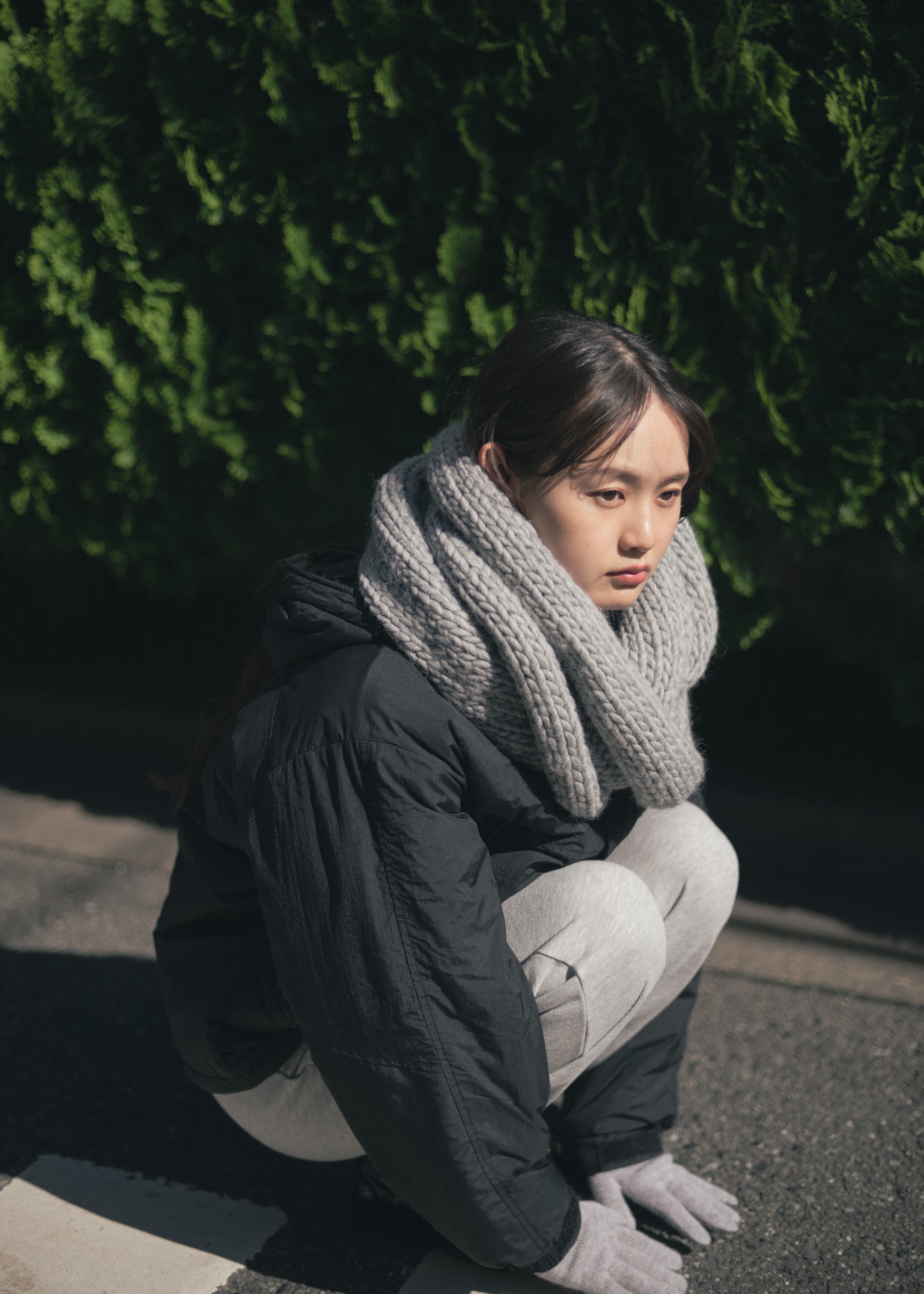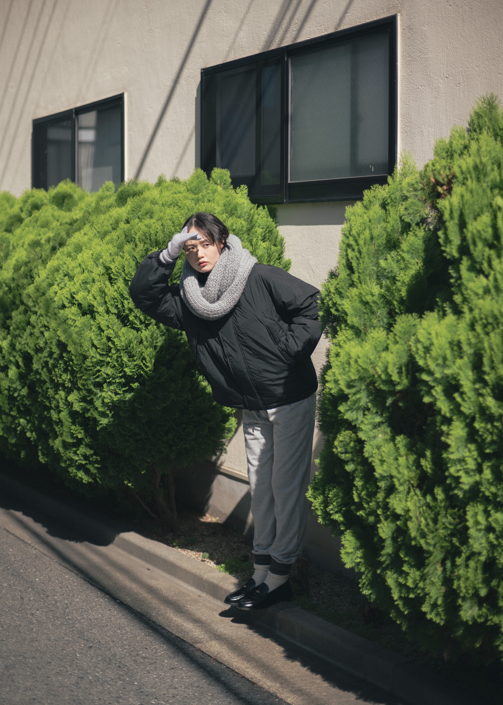 ジャケット¥19998、スウェットパンツ¥4994 / ともにFREAK’S STORE(フリークス ストア渋谷)、スヌード¥22000 / Véritécoeur(ヴェリテクール)、グローブ¥8690 / WILLIAM BRUNTON(セムインターナショナル)、ソックス¥2420 / HOiSUM(ホイサム)、ローファー¥31900 / CAMINANDO(グラビテート)