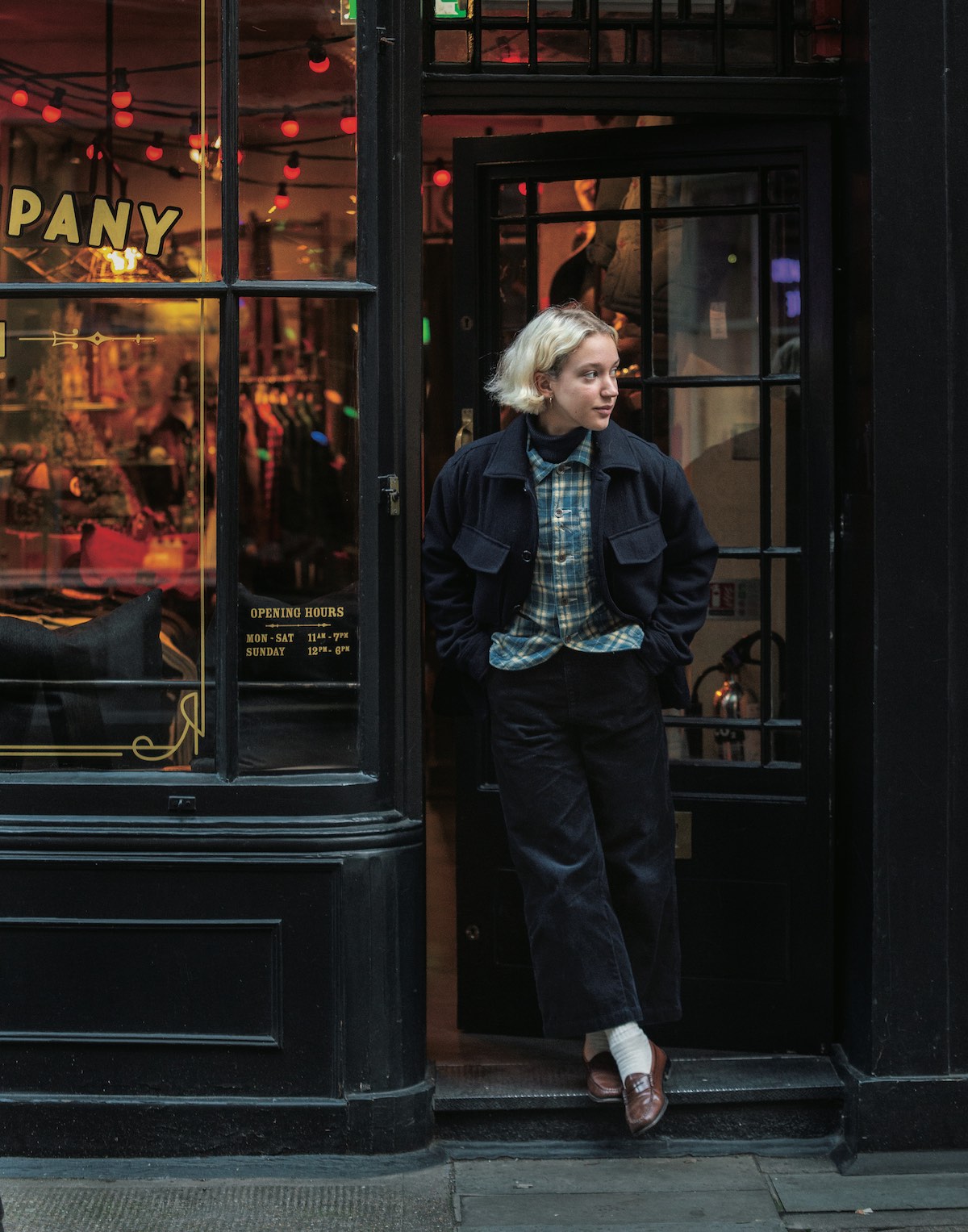 彼女は仕立てのいいジャケットや、エイジングを感じるシャツを使った品のあるヴィンテージMIX がお得意。そんな上質なコーディネートに合わせたのは実は《ユニクロ》のパンツ!絶妙な太さとラインでボーイズライクな印象に。イビーを基調としたスタイルに、差し色要員でブラウンのローファーを投入していたのもいい!