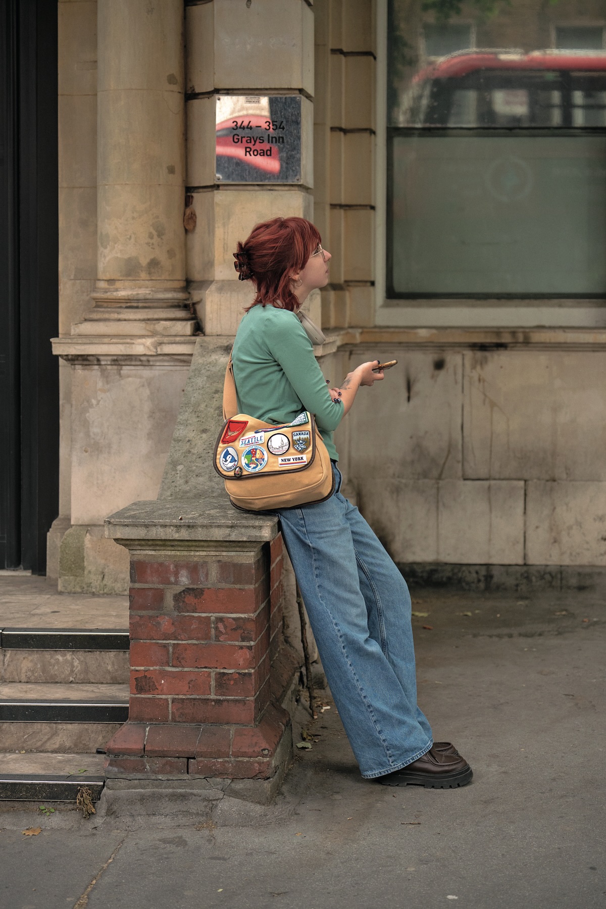 ワッペン集めが趣味のMajaは、リメイクしたてのバッグがオキニ。ミントグリーン×ブルーデニムの色合わせがお見事。足元は革靴でしっかり引き締めて。