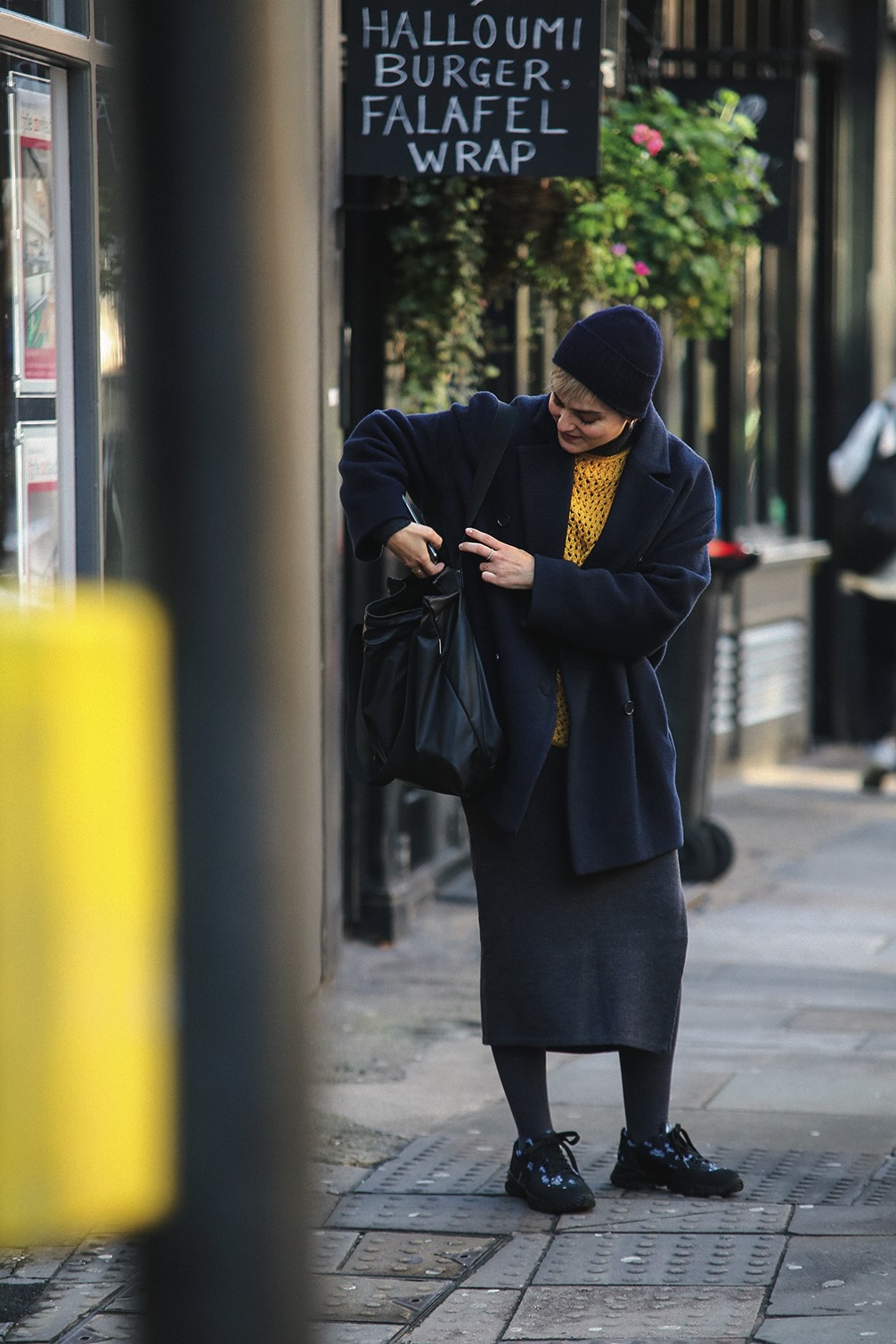 ざっくりセーターは自身のハンドメイドによるもの!ポップなイエローをあえて重厚感のある装いに合わせて。ユニクロのニット帽をコーデの仕上げにオン。