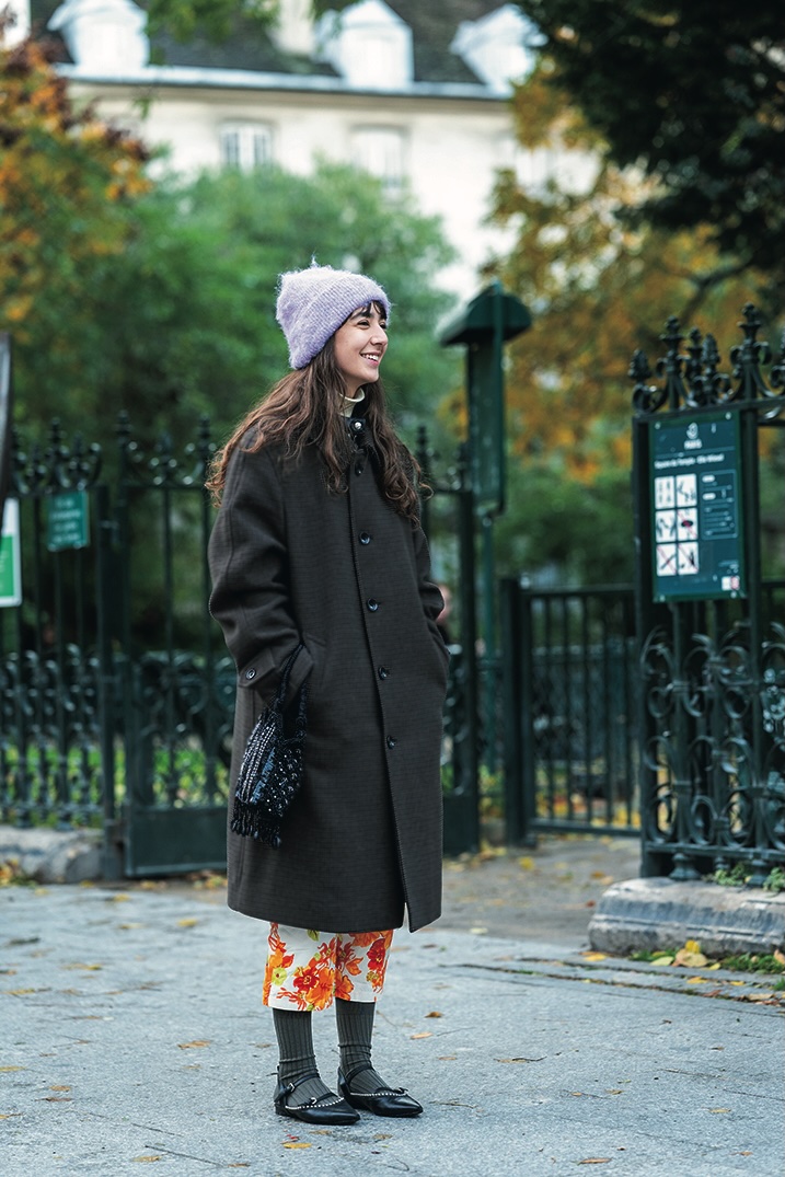 シンプルな《ユニクロ》のコートが小粋な花柄のパンツを引き立たせる。ビジューがきらめくストラップシューズも素敵だし、花柄パンツの丈感も最高