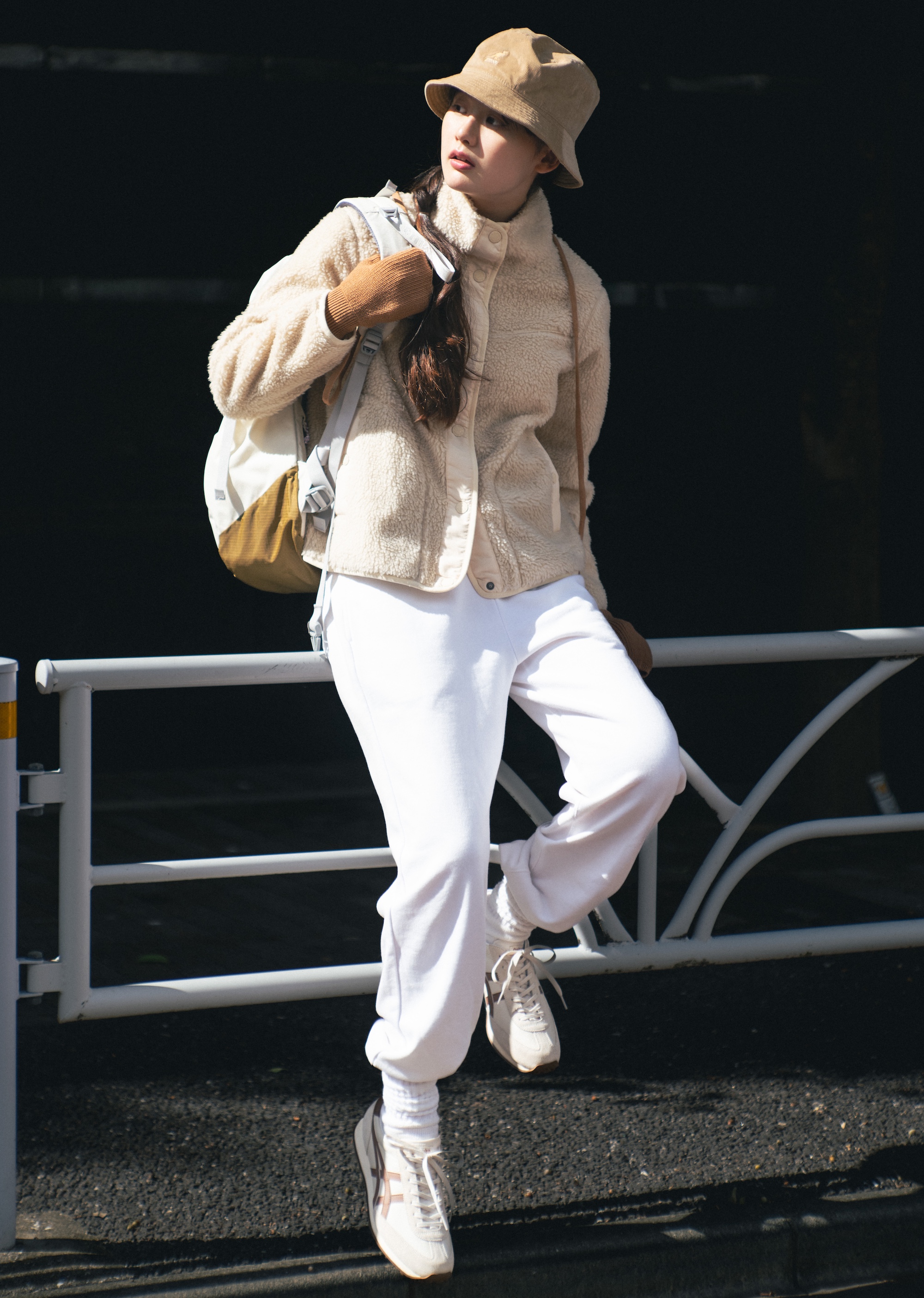 あたたかみのあるジャケット、やわらかなスウェット、バケットハットで冬のアウトドアスタイルができあがり。毛並みを意識した、ボアや茶色のグローブでネコっぽさをだして。茶色を差し色することで、オールホワイトよりもラフにトライしやすいかも。