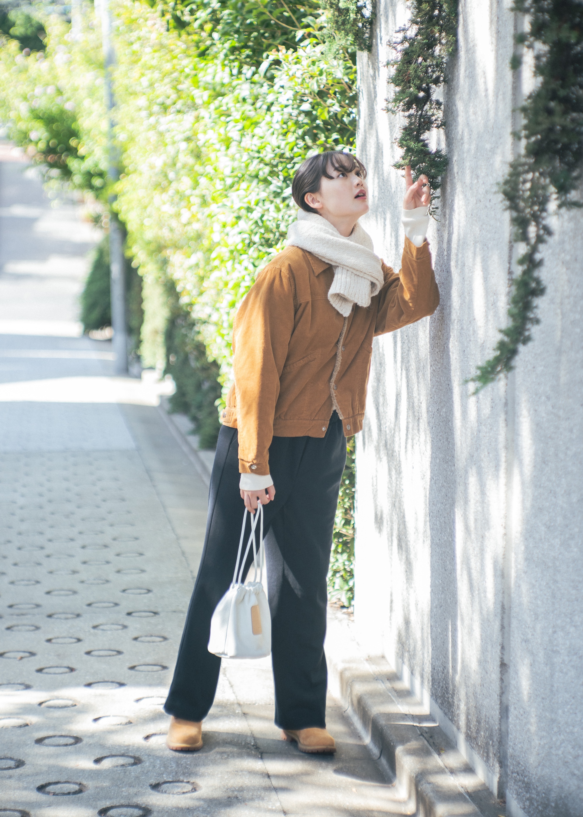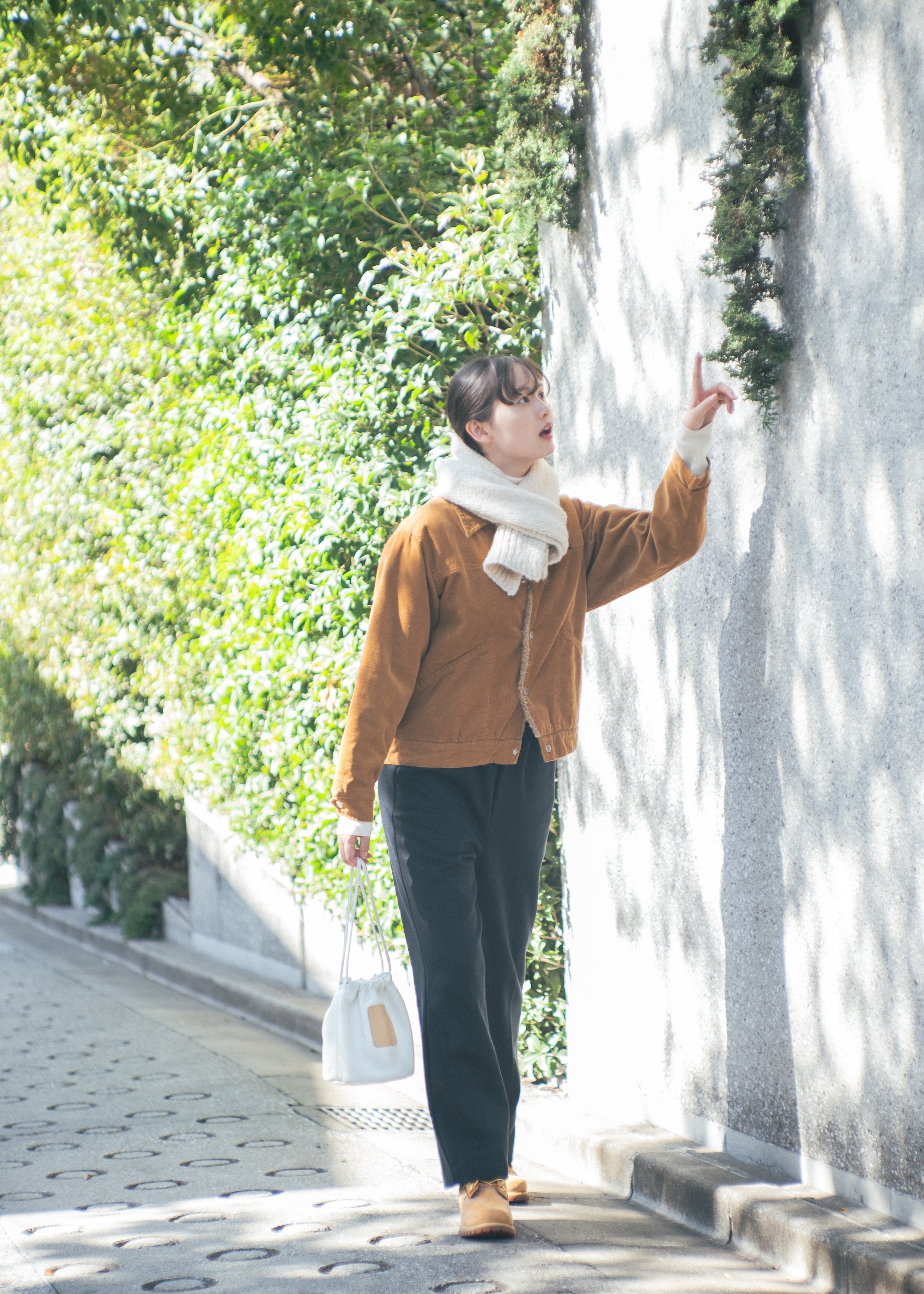 ブルゾン¥23100 / Wrangler(エドウイン カスタマーサービス)、タートルネックカットソー¥4400 / FREAK’S STORE(フリークス ストア渋谷)、パンツ¥14960 / MidiUmi(マザーズ インダストリー)、マフラー¥7920 / FRATELLI TALLI(セムインターナショナル)、バッグ¥34100 / Scye(マスターピースショールーム)、ブーツ¥30800 / Timberland(VF ジャパン)