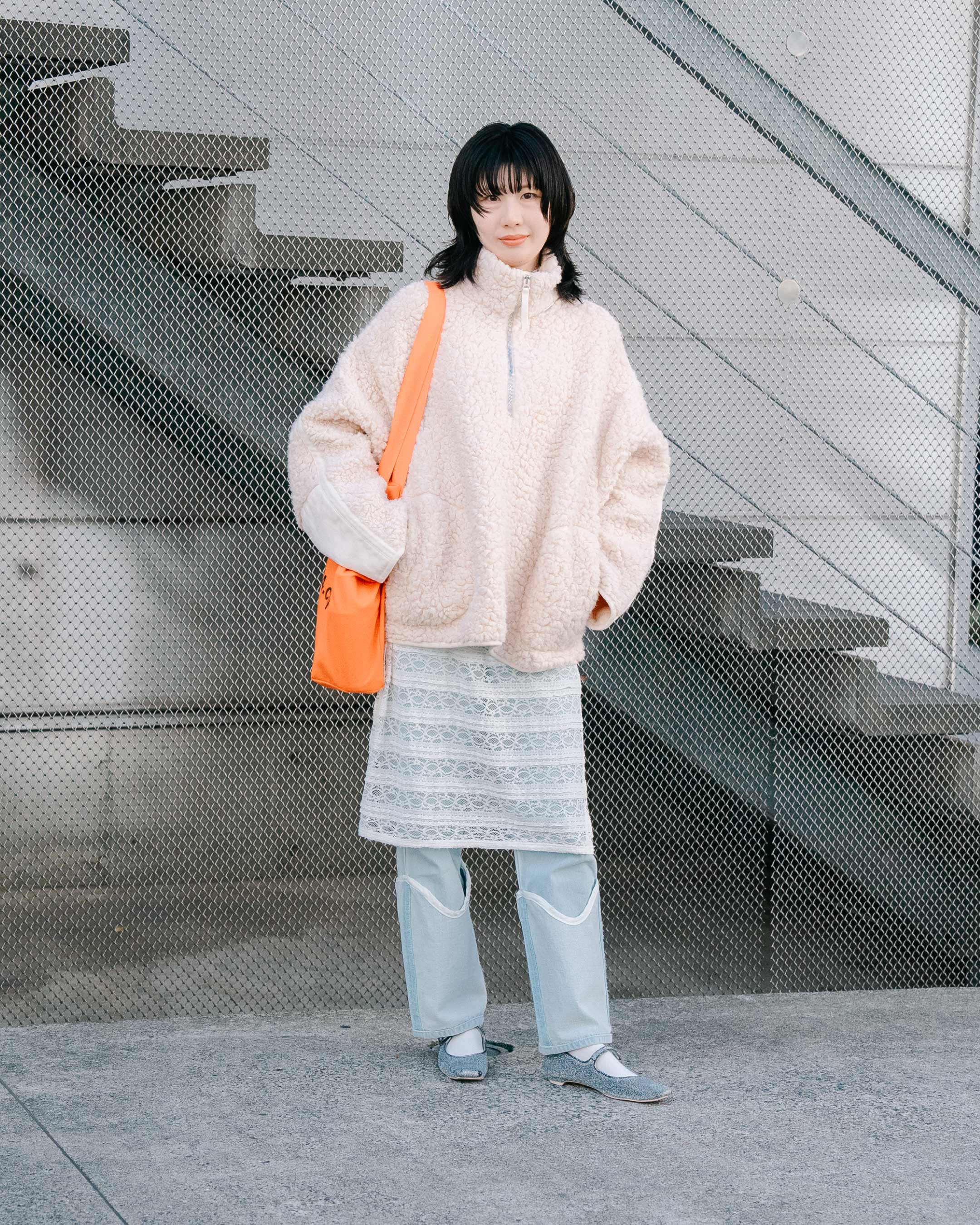 ちょっぴり勇気のいる色に挑戦してみたい。パキッと発色したオレンジをいろいろな素材の白で引き立てれば、すっかりカラフルマスターの佇まい。もこもこのボア小物で、ボーイッシュな日も愛嬌を忘れずに。