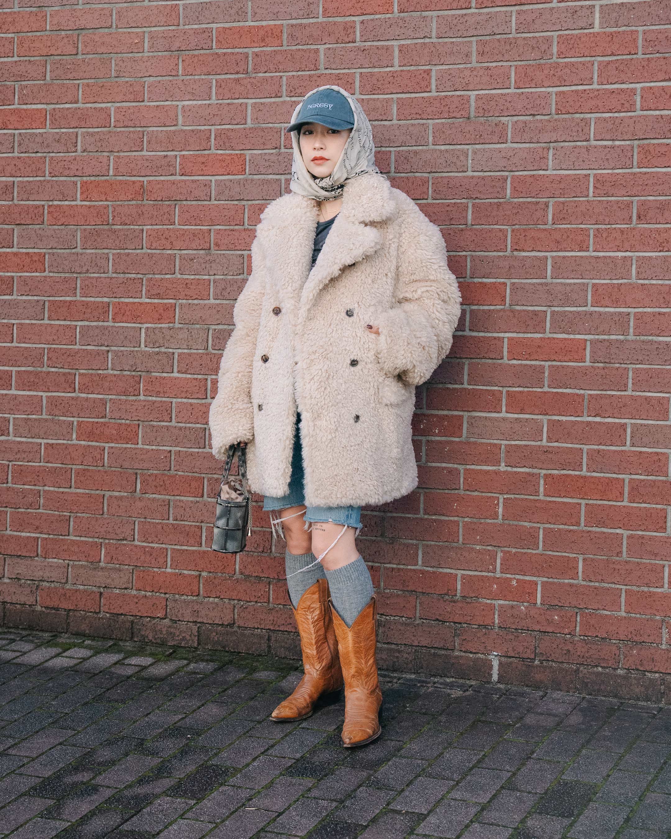 モコモコのアウターを主役に、トレンドのスカーフを取り入れてトレンド感も。