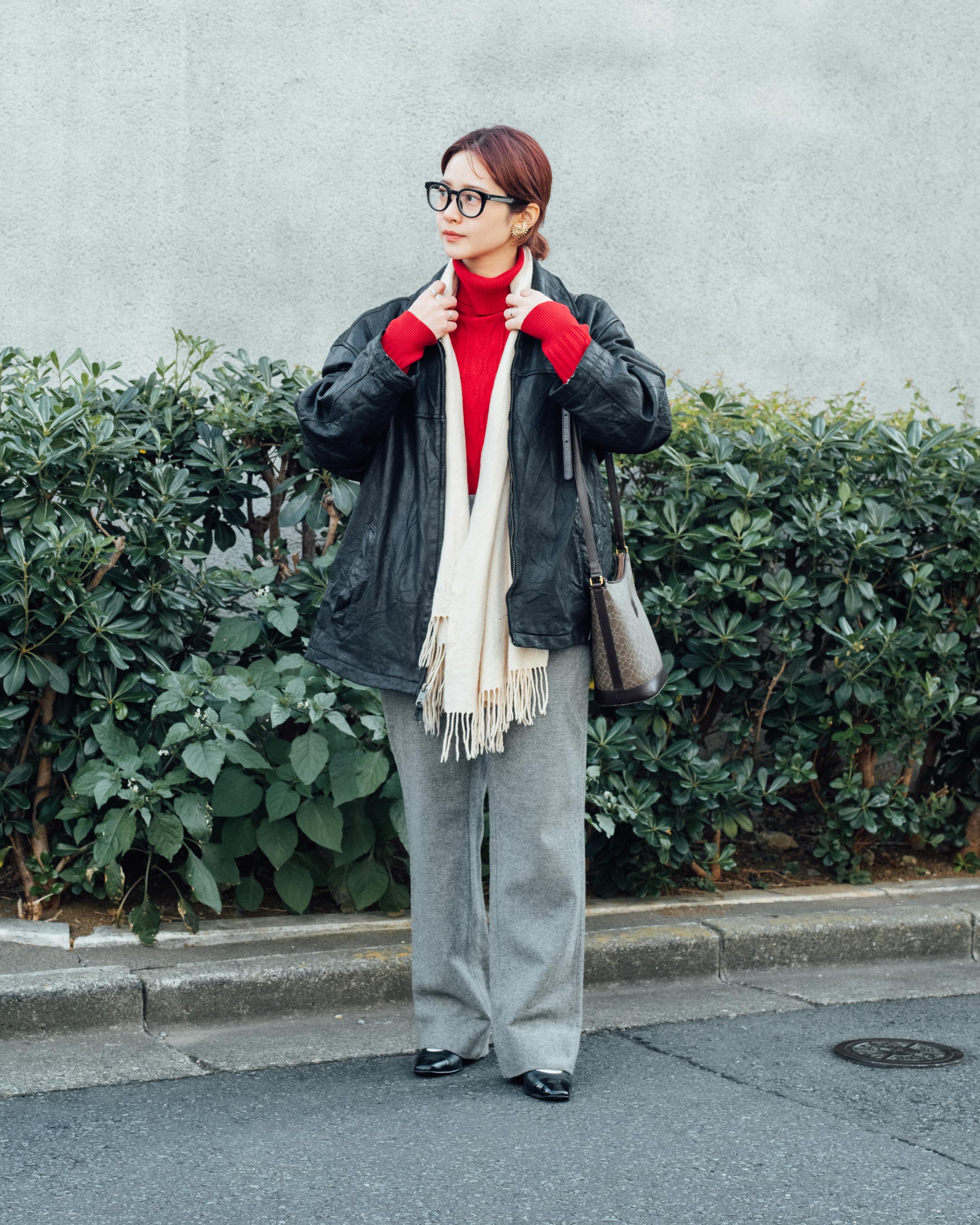 赤いニット差し色を入れた、レザージャケットのお手本コーデ