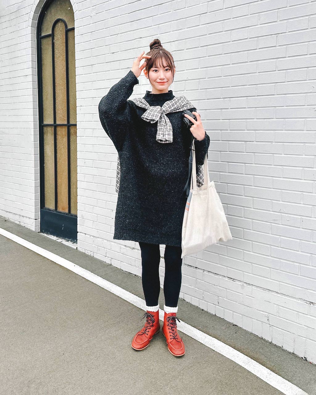 ▶︎ざっくりニットワンピを主役にレザーブーツを合わせて秋らしく♪おだんごヘアやトートバッグでカジュアルダウンさせて