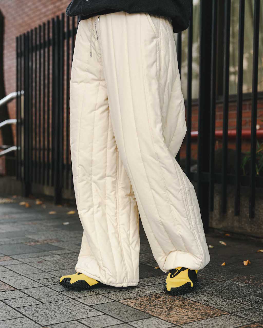 ボリューミーなキルティングパンツは抜け感のあるホワイトカラーが新鮮! 黒&白でコントラストを強め、存在感のあるパンツを引き立てて。カラースニーカーもお似合い。