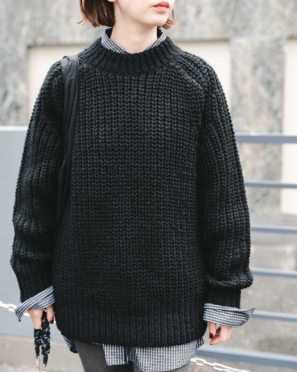 ルーズニットにミニボトム、ロングブーツの組み合わせがトレンド感たっぷり。ブラックベースの装いはチェックシャツを重ねると奥行きが出て効果的なアクセントに。
