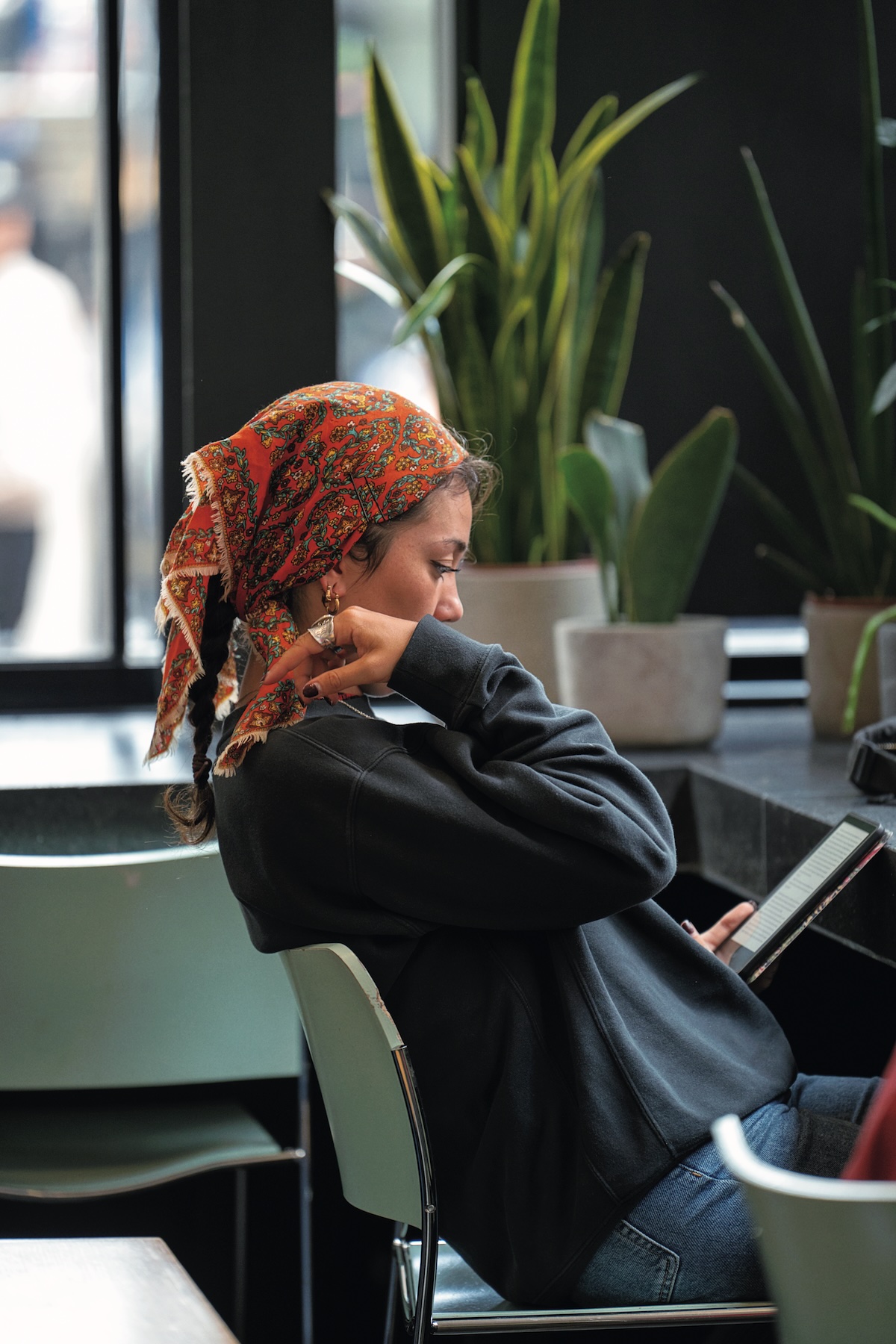 ▶︎スウェットとデニムのシンプルコーデの日は、アクセサリーはヘアアイテムを思いっきり楽しんで