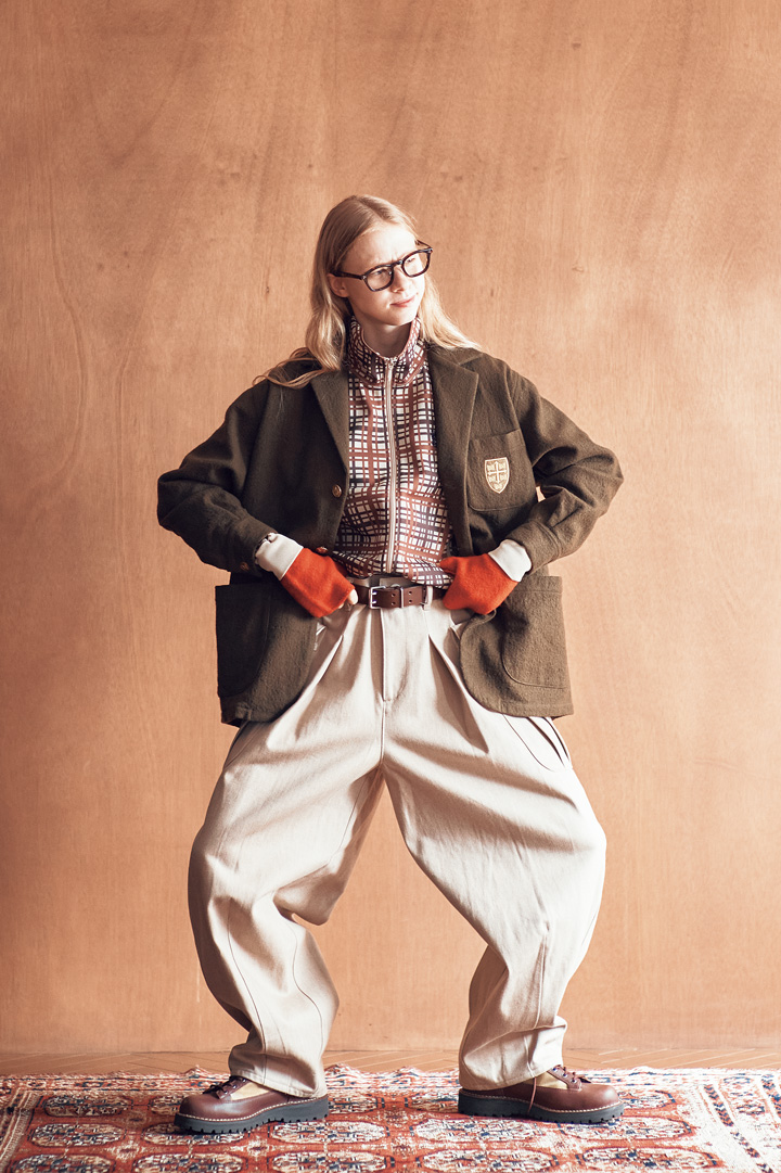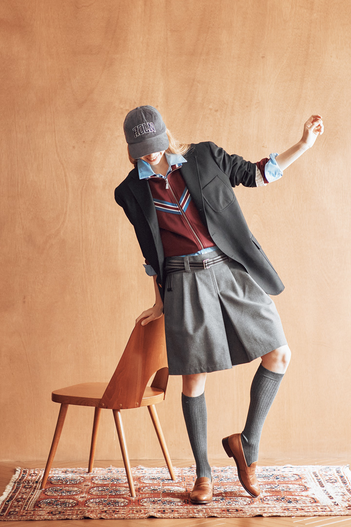 ジャケット¥52800/F/CE.®︎(エフシーイーフラッグシップストアトウキョウ)、トラックジャケット¥20900/Onitsuka Tiger( オニツカタイガージャパン)、シャツ¥19800 /BRITISH MADE、スカート¥37400/macalastair × O’NEIL OF DUBLIN(ともにブリティッシュメイド 青山本店)、カットソー¥5390/ROBERT P.MILLER ×JEANS FACTORY(ジーンズ ファクトリー卸団地本店)、グローブ¥3850/ROTOTO(ロトトショールーム)、ブーツ¥95700/ADIEU(バウ インク)