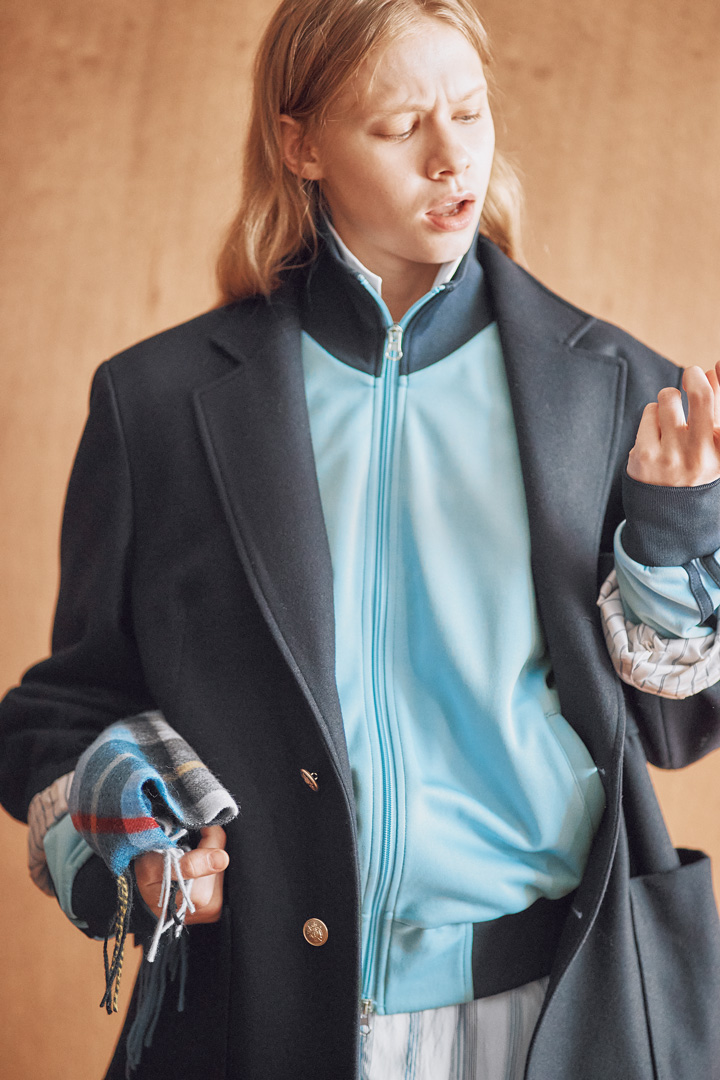 ジャケット¥86900/Tangent(タンジェント)、トラックジャケット¥7590/United Athle(キャブ)、中に着たシャツ¥46200/agnèsb.(アニエスベー)、中に着たワンピース¥53900/tActi( ネペンテス ウーマン トウキョウ)、手に持ったマフラー¥7590/TWEED MILL(セムインターナショナル)